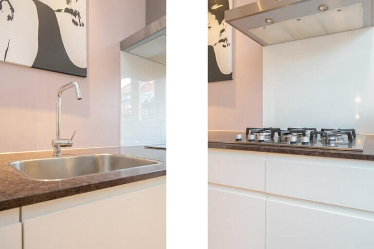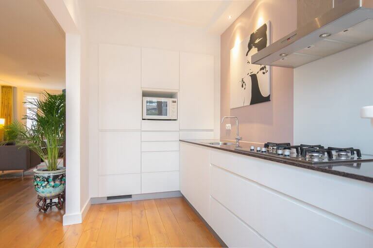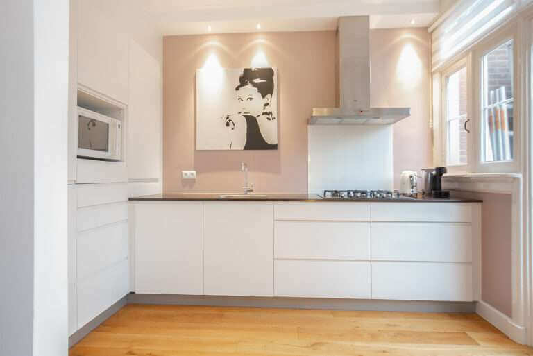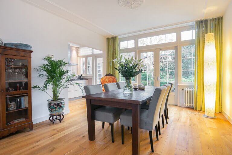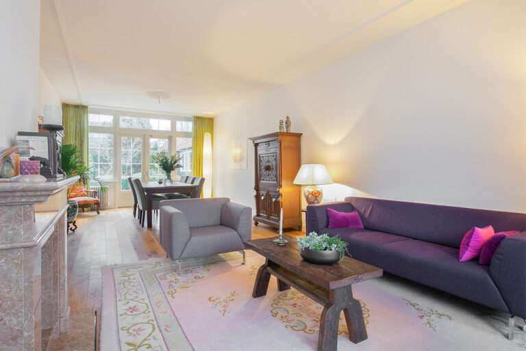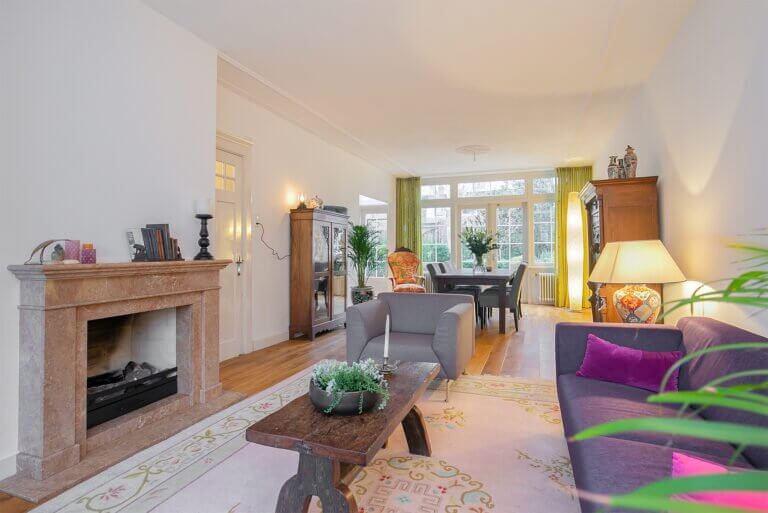 Statige hal, separaat toilet, doorgang naar de ruime lichte woonkamer voorzien van hoge plafonds en sfeervolle houten vloer. Vanuit de woonkamer bereik je de half open keuken welke aan de achterzijde van de woning ligt en grenst aan de zonnige tuin. De moderne keuken is voorzien van divers inbouwapparatuur zoals: koelkast, gasfornuis, magnetron en vaatwasser. De tuin is te bereiken vanuit de woonkamer middels openslaande deuren. De zonnige tuin is voorzien van een houten berging.