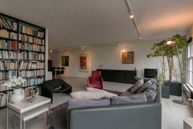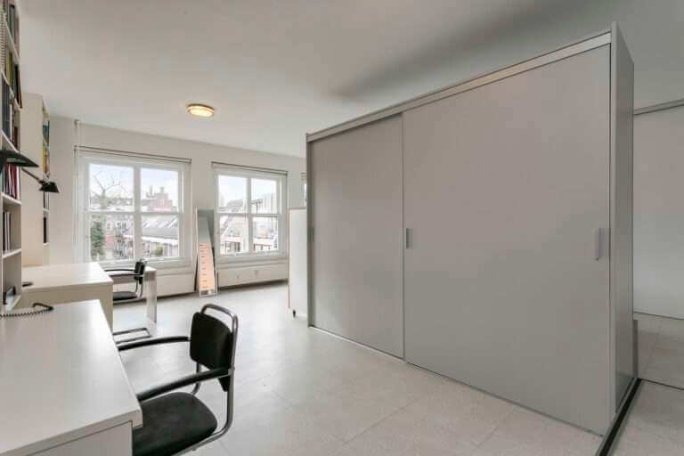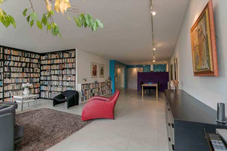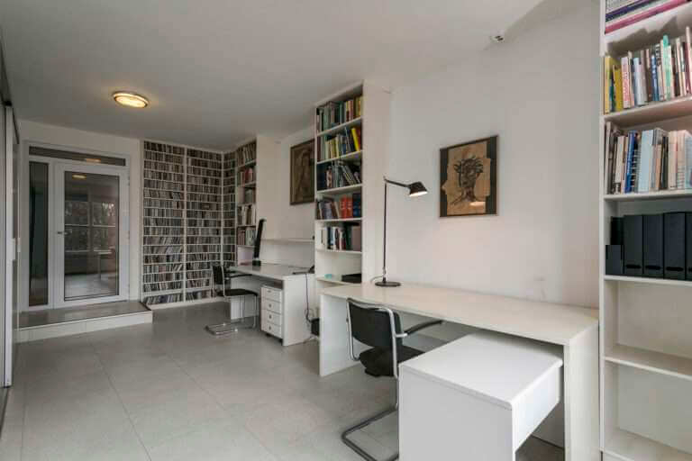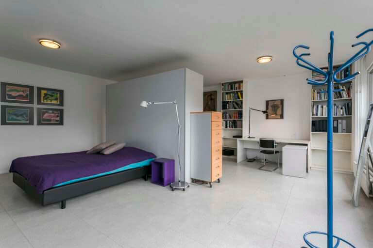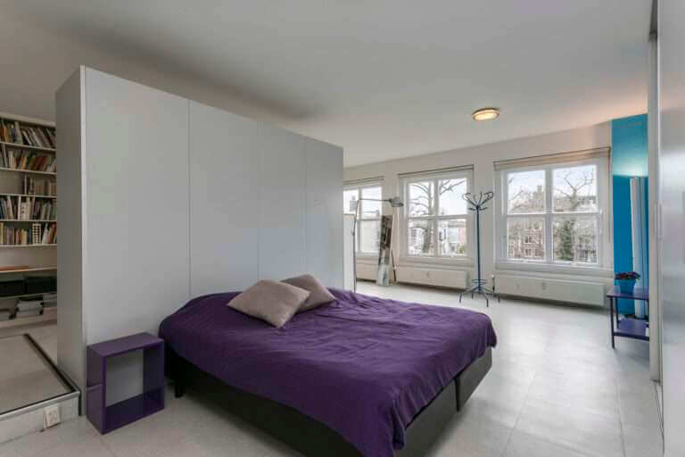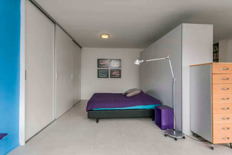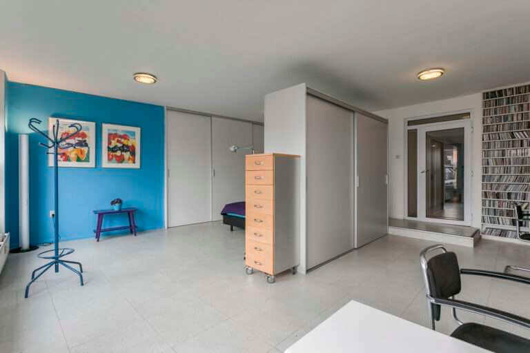 Vanuit de lange gang heeft u tevens toegang tot de riante slaap/werkkamer, de badkamer en een separaat toilet. De lichte slaapkamer is tevens ingericht als werkkamer en is voorzien van 2 bureau’s. Het bed is afgescheiden door een aparte kastenwand. De ruime badkamer is voorzien van een ligbad, aparte douche, wastafelmeubel en wasmachine.