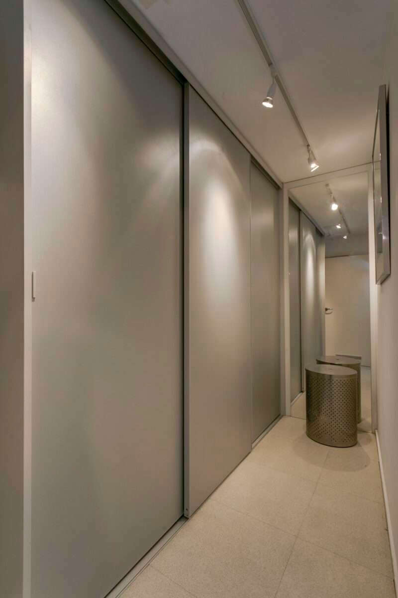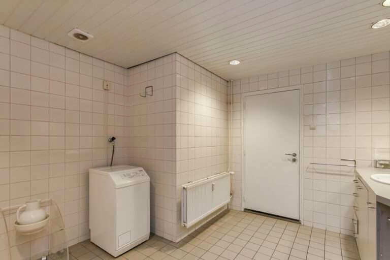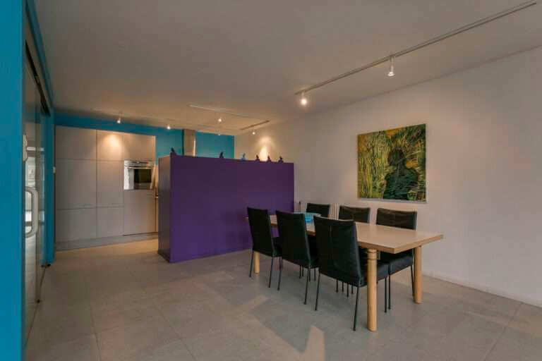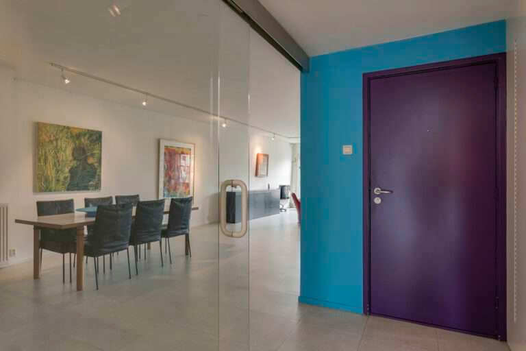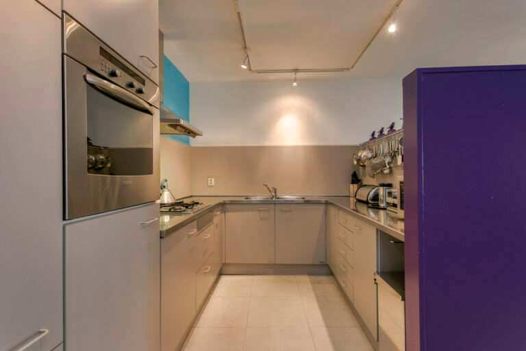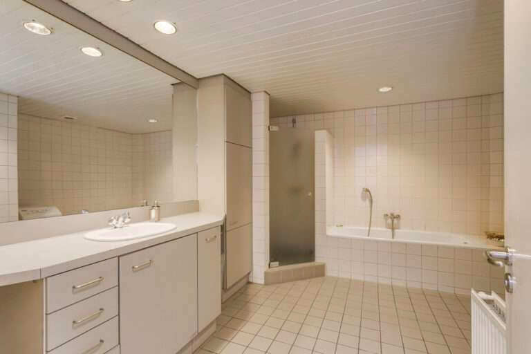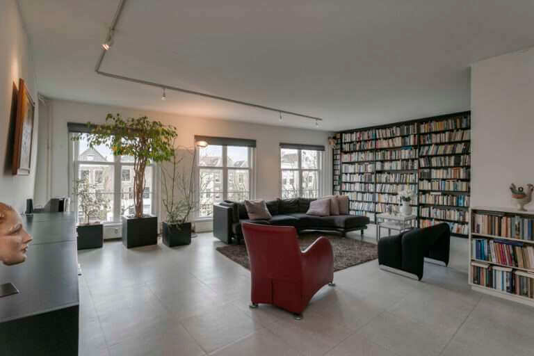 Vanuit de lange gang heeft u tevens toegang tot de riante slaap/werkkamer, de badkamer en een separaat toilet. De lichte slaapkamer is tevens ingericht als werkkamer en is voorzien van 2 bureau’s. Het bed is afgescheiden door een aparte kastenwand. De ruime badkamer is voorzien van een ligbad, aparte douche, wastafelmeubel en wasmachine.