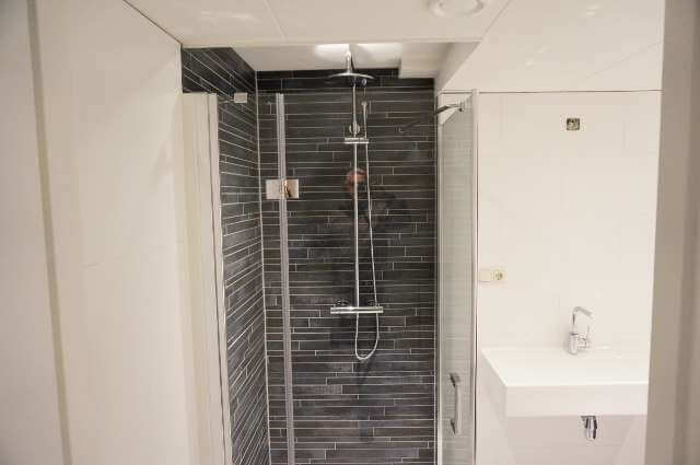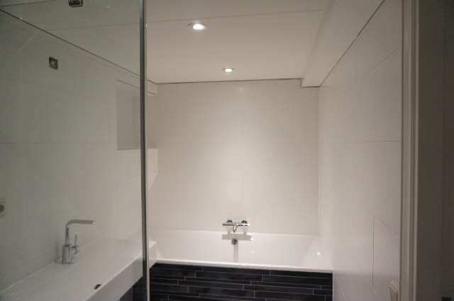 Vanuit de keuken heeft u toegang tot de nieuwe badkamer, met douche, wastafel en bad. Vanuit de keuken is er een deur naar de nieuwe toilet.