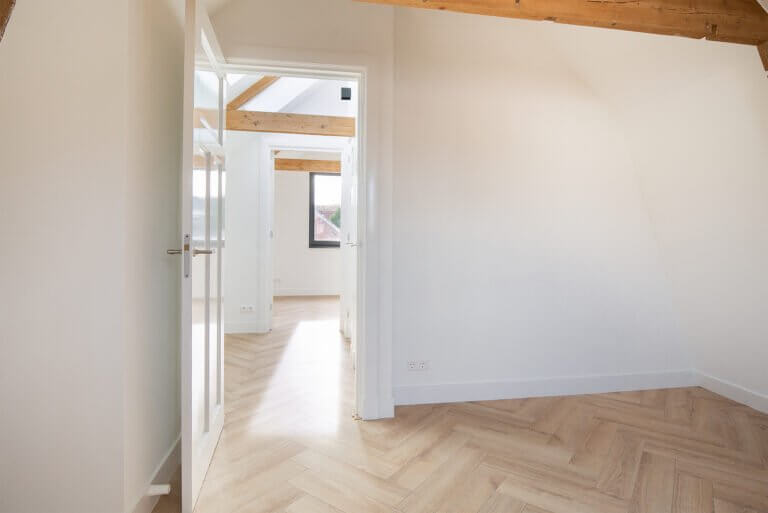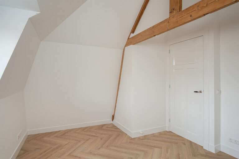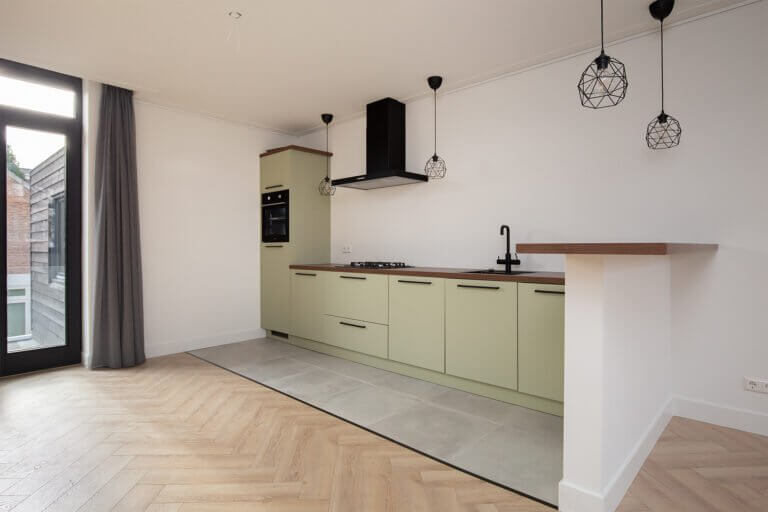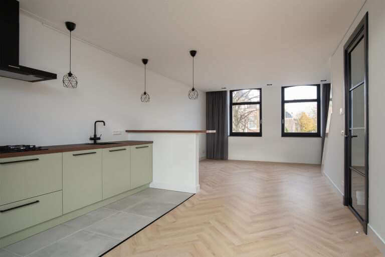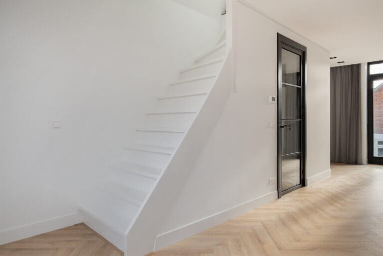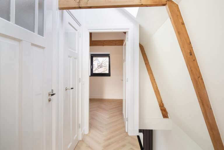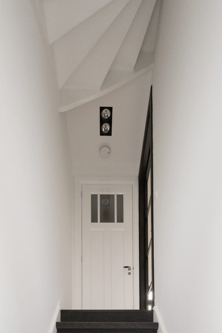 De trendy bovenwoning kenmerkt zich door het gebruik van stijlvolle materialen, zoals een moderne visgraat vloer, zwarte kozijnen en deuren, ingebouwde ligspots.