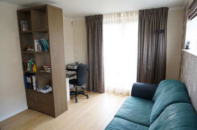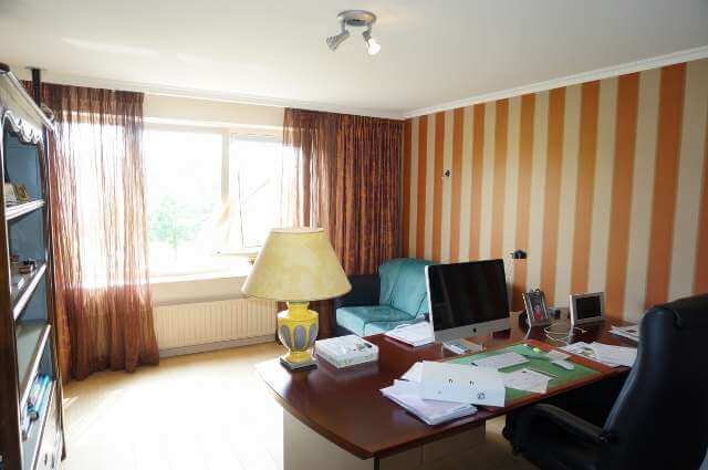Eerste verdieping is voorzien van houten vloeren , kantoorruimte, grote slaapkamer met balkon op het Noorden, slaapkamer, was/strijkkamer en badkamer.