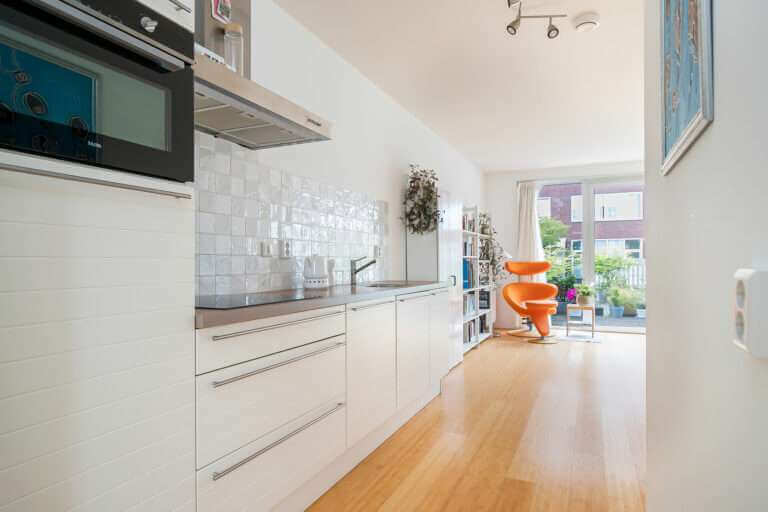 Eerste verdieping: Lichte woonkamer met openslaande deuren naar het zonnige terras (op het zuiden), gelegen aan het autoloze binnenterrein. Open keuken met inbouwapparatuur. Eetkamer met tafel en bureau. Op de overloop bevindt zich een separaat toilet.