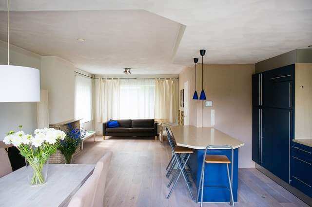 In de woonkamer is het bijzonder licht door de volledig glazen schuifdeuren met uitzicht op de aangelegde achtertuin. De gemeubileerde kamer heeft een open haard en recentelijk vernieuwde houten vloer.