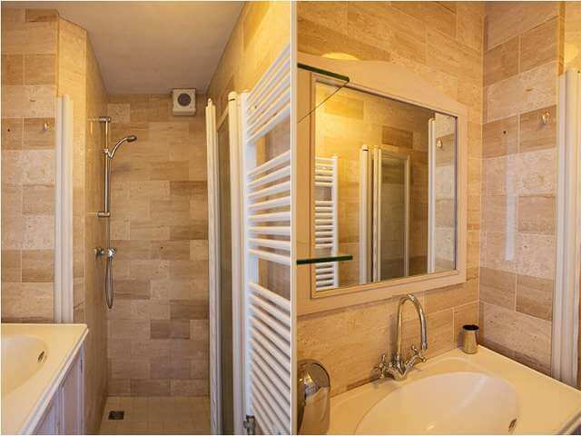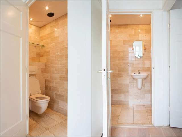 Op deze verdieping bevindt zich een van formaat bescheiden maar luxe badkamer met onder meer marmeren tegels.