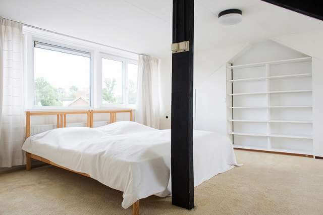 De zolder is omgebouwd tot een grote ruimte met veel opslagruimte. Drie dakkapellen zorgen voor veel daglicht. De twee eenpersoonsbedden kunnen ook geschakeld worden. Er staat een bureau voor het raam en boekenkasten zijn geïntegreerd tussen twee grote kasten.