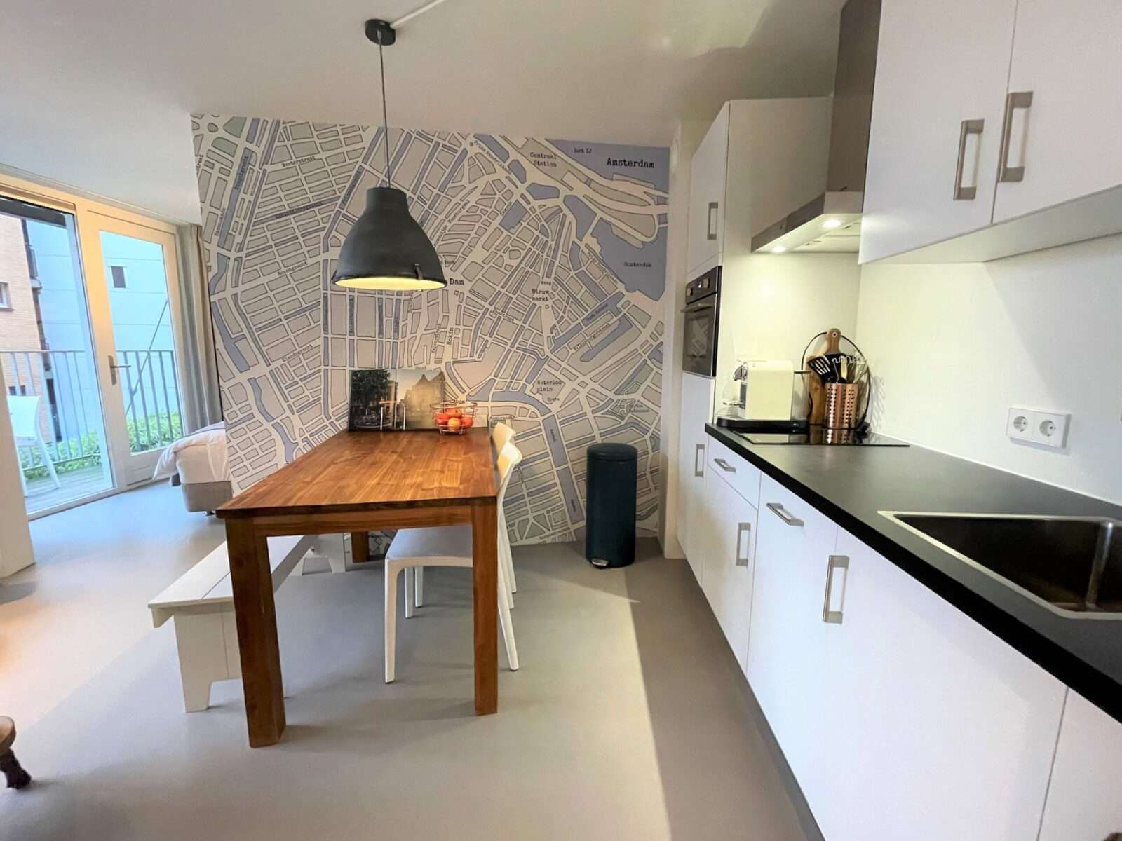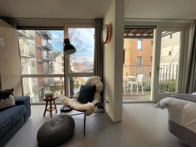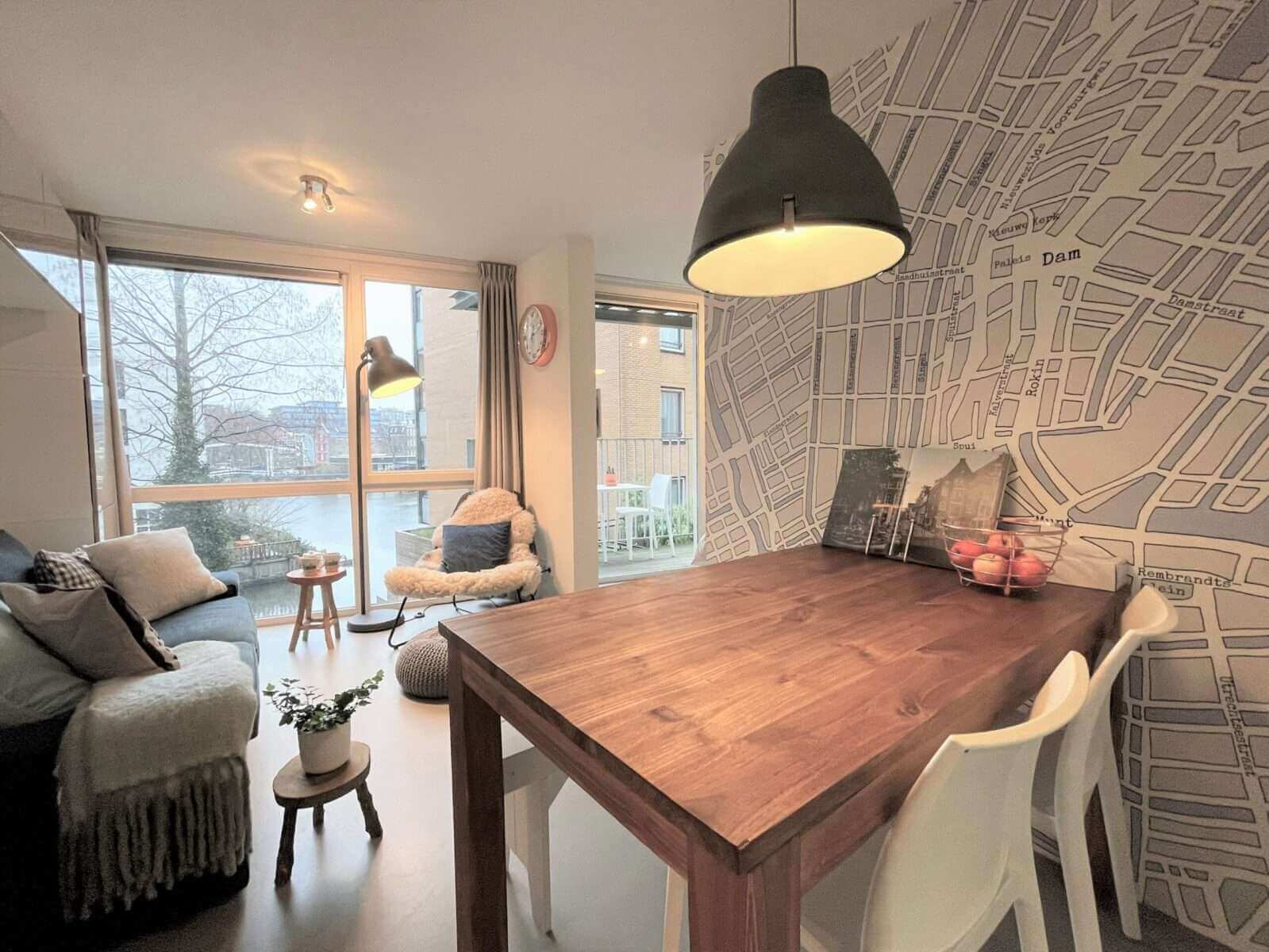 De keukentafel kan goed als bureau fungeren: werk thuis met het beste uitzicht van Amsterdam! De woonkamer is erg licht en heeft een comfortabele bank en stoel.