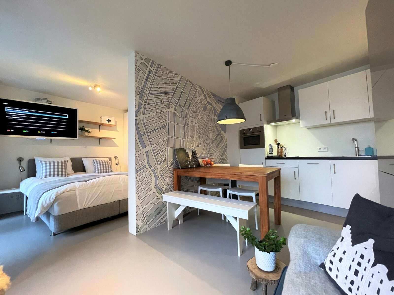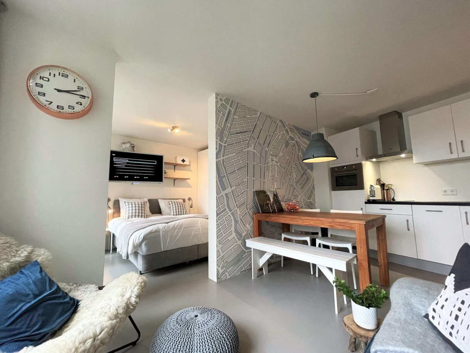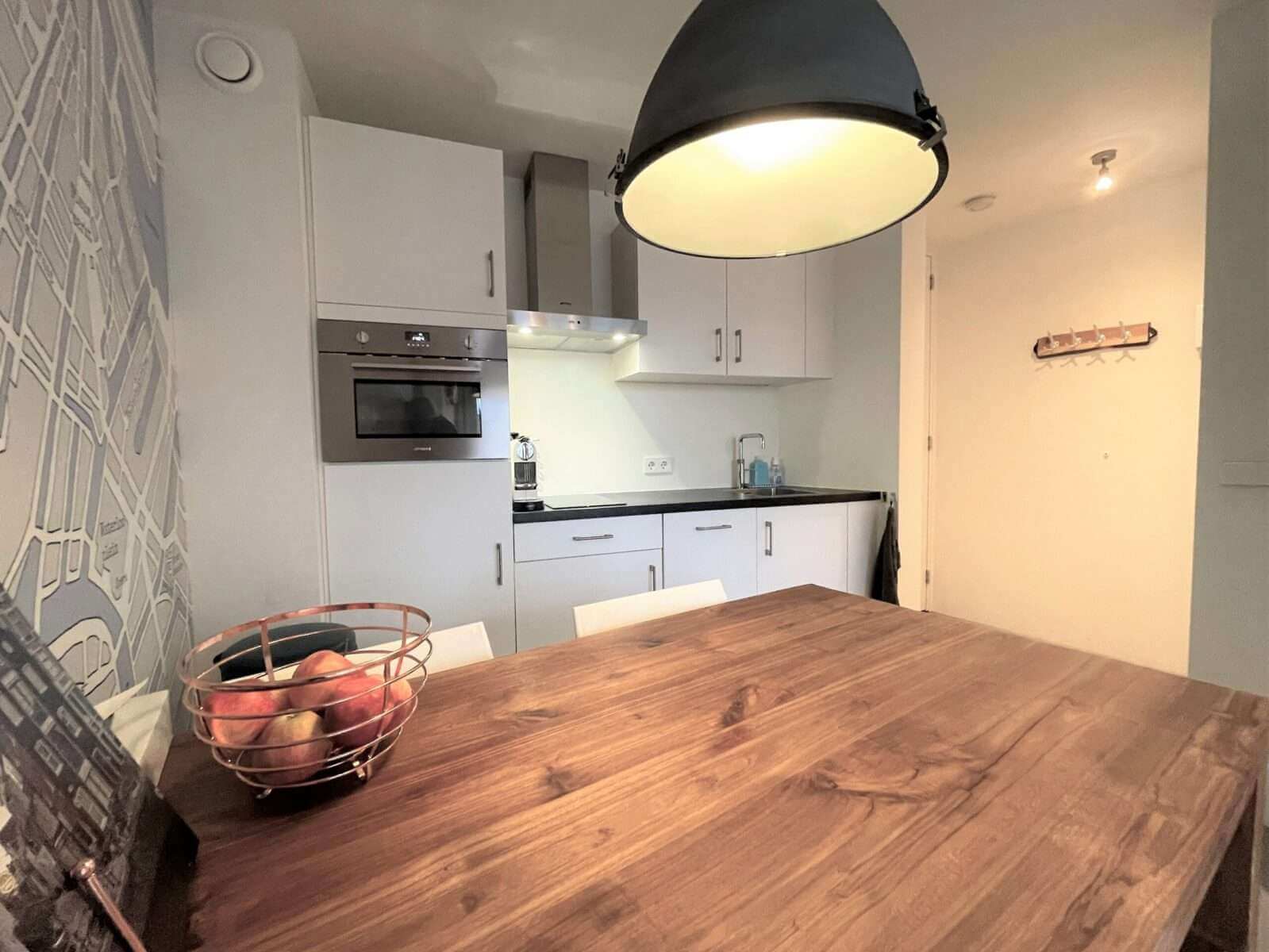 De keukentafel kan goed als bureau fungeren: werk thuis met het beste uitzicht van Amsterdam! De woonkamer is erg licht en heeft een comfortabele bank en stoel.