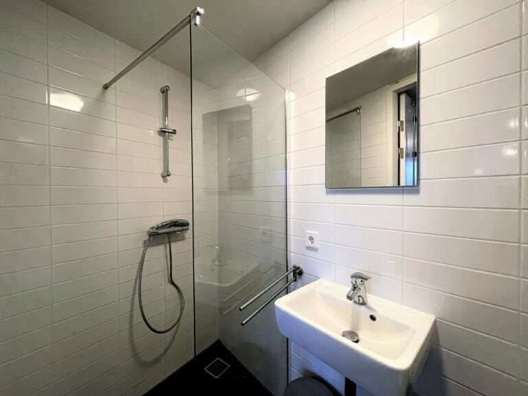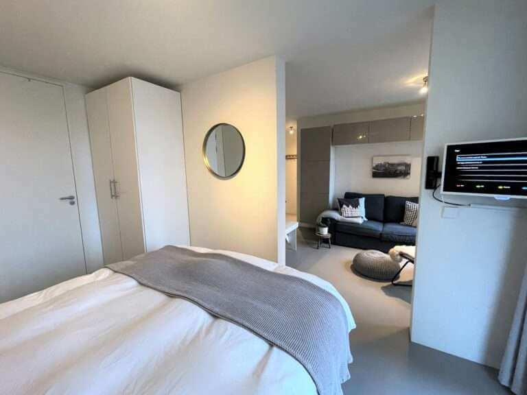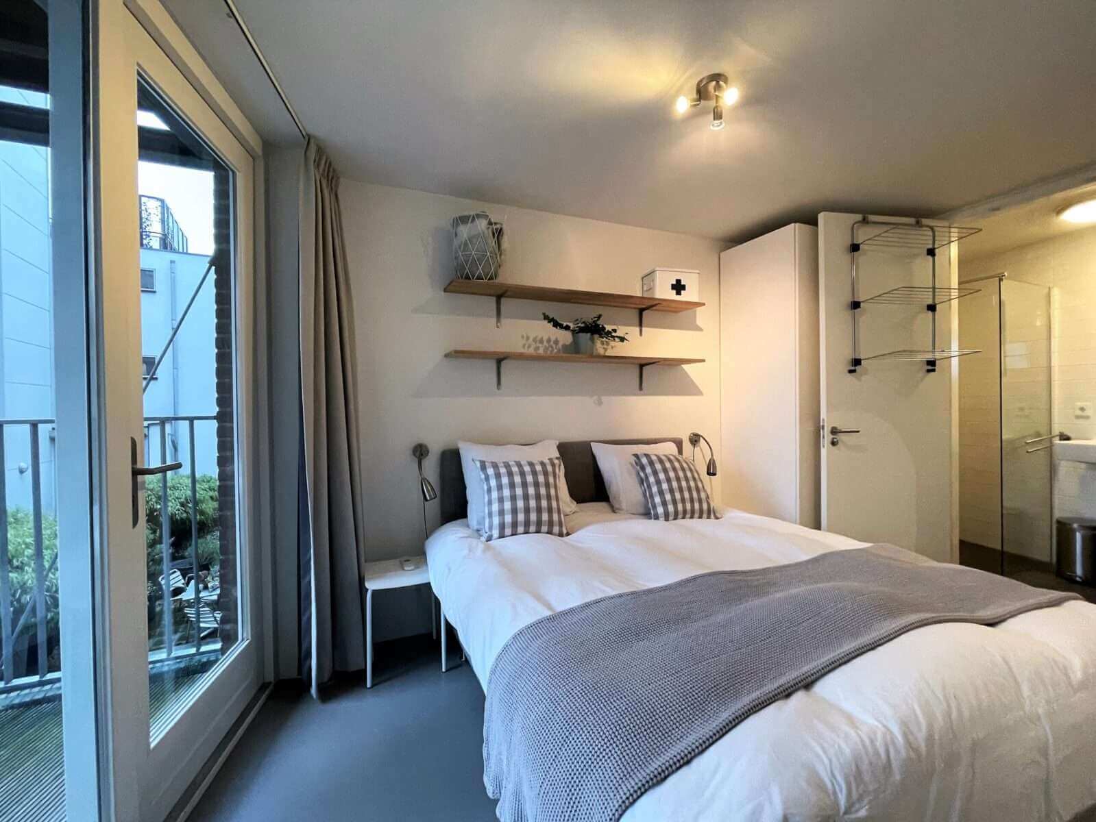 De aparte slaapkamer beschikt over een balkon. De moderne badkamer is voorzien van toilet, douche en wastafel.