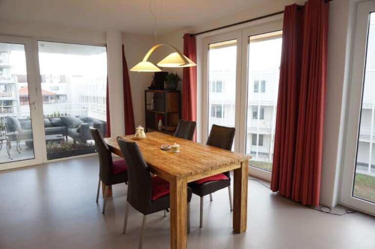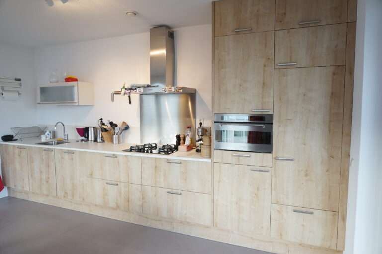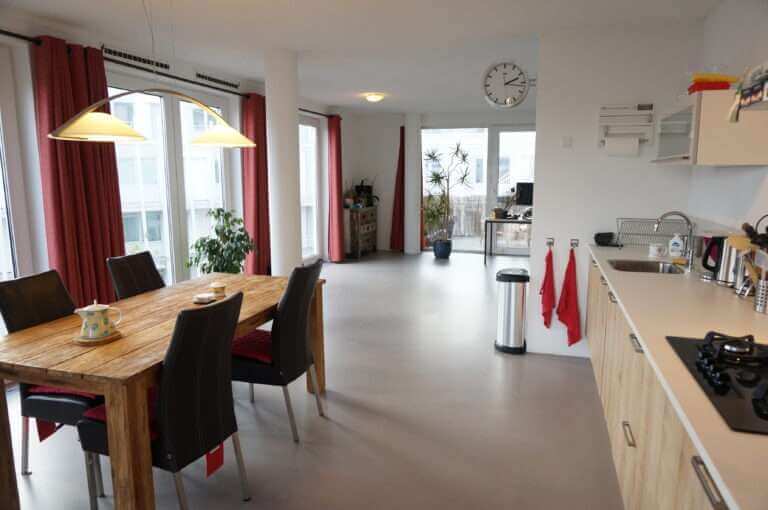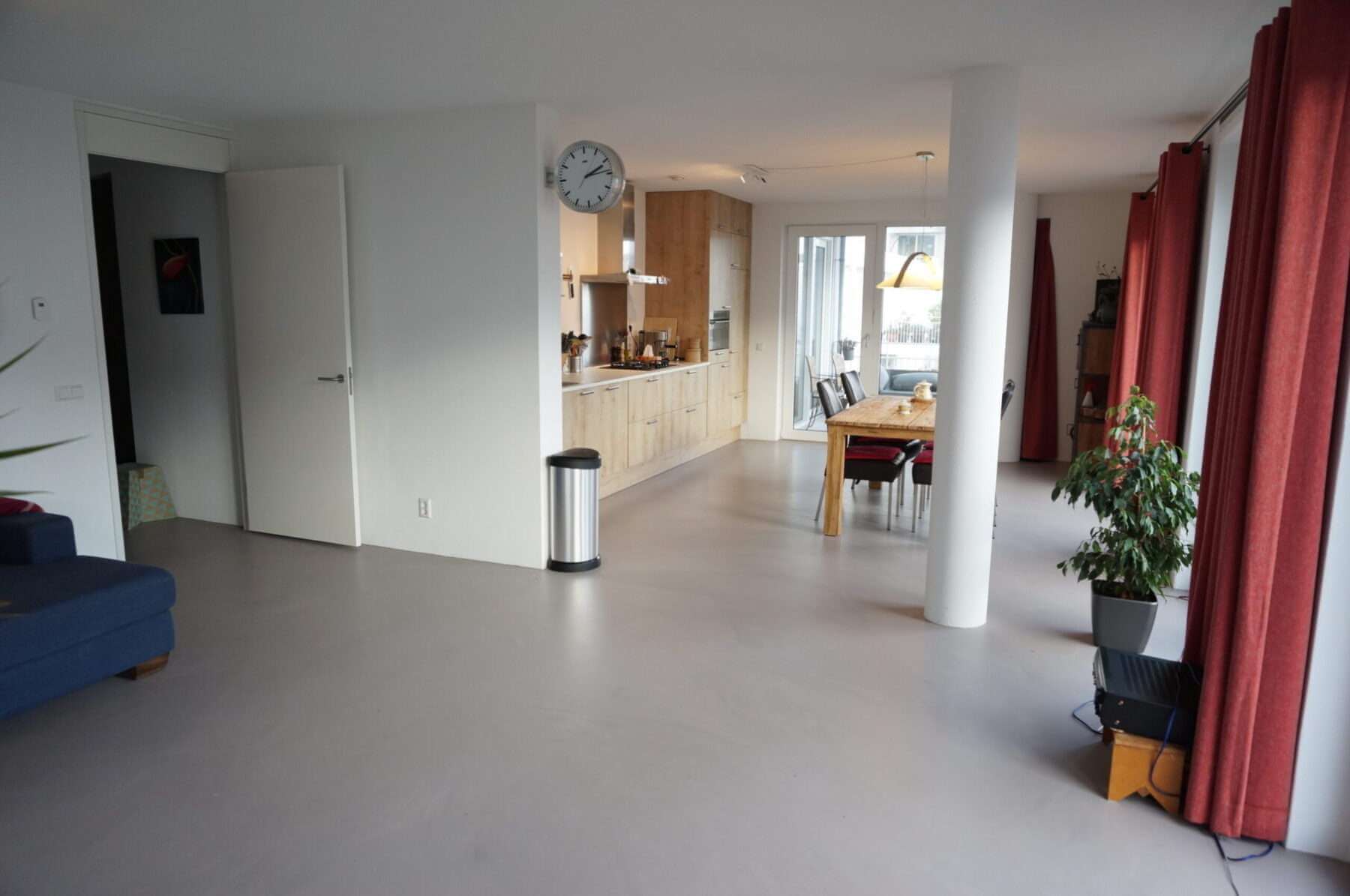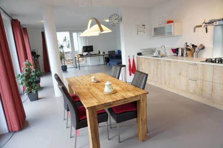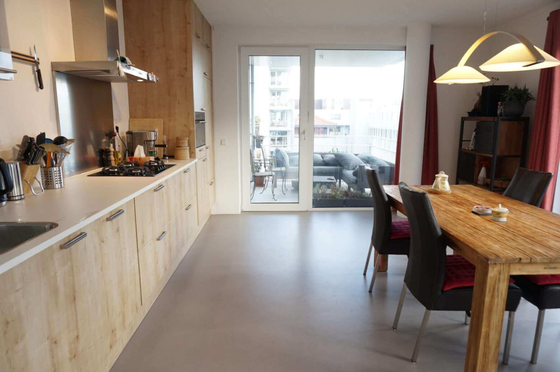 Moderne, ruime woonkamer met grote raampartijen en open keuken. De keuken is voorzien van een combimagnetron, vaatwasser, 4 pits gasstel en espresso machine.
