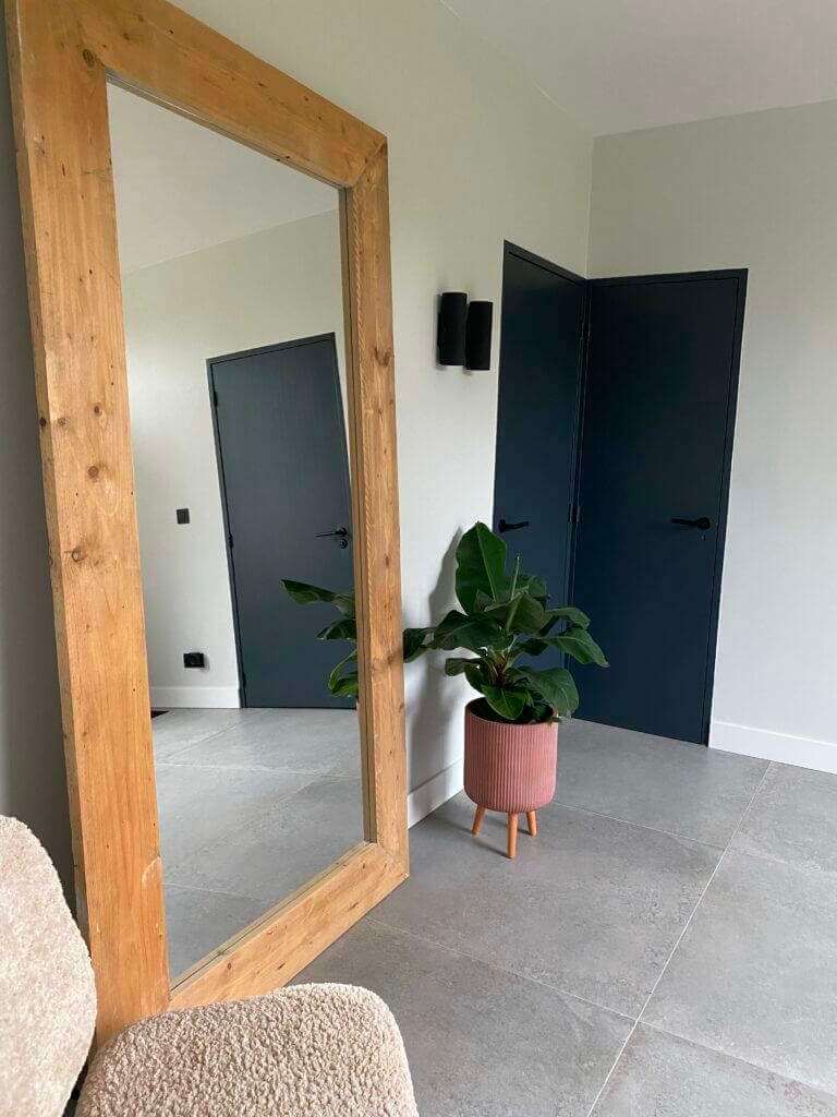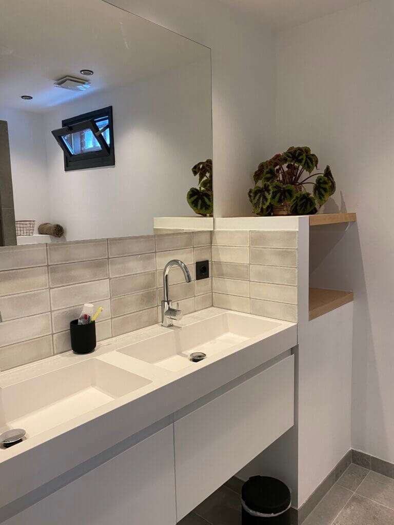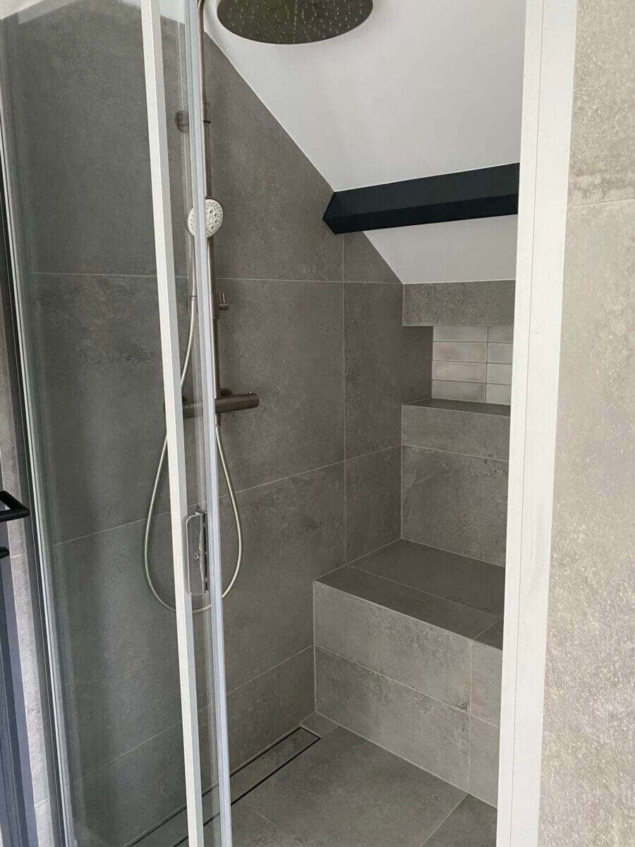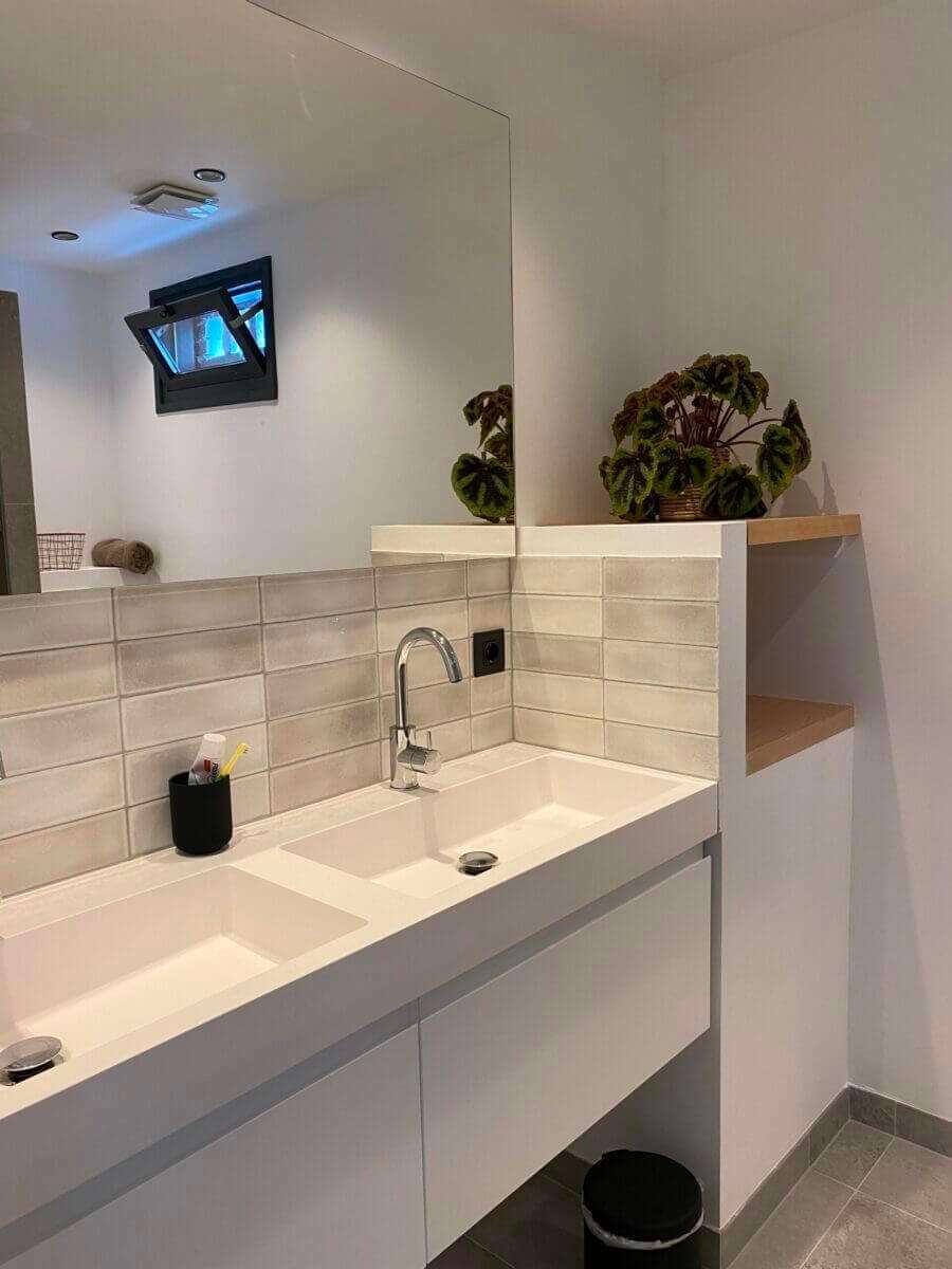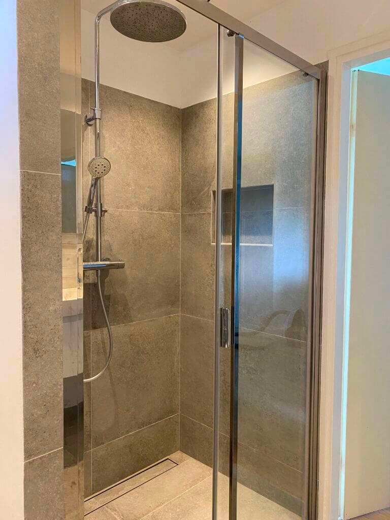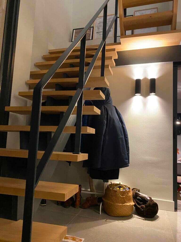 De open houten bordestrap brengt u op de eerste etage. Deze etage kenmerkt zich weer door de ruime opzet en de 4 slaapkamers. De moderne badkamer is uitgevoerd met een dubbele wastafel, inloopdouche en een toilet en uitgerust met vloerverwarming. Tevens is er een was koker aanwezig welke uit komt op de begane grond.