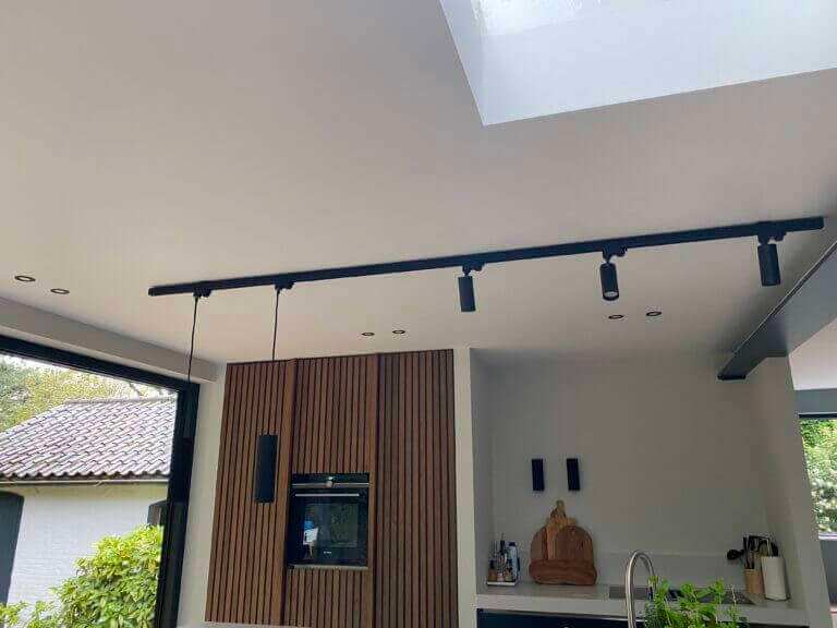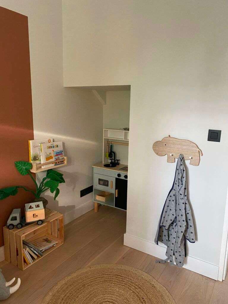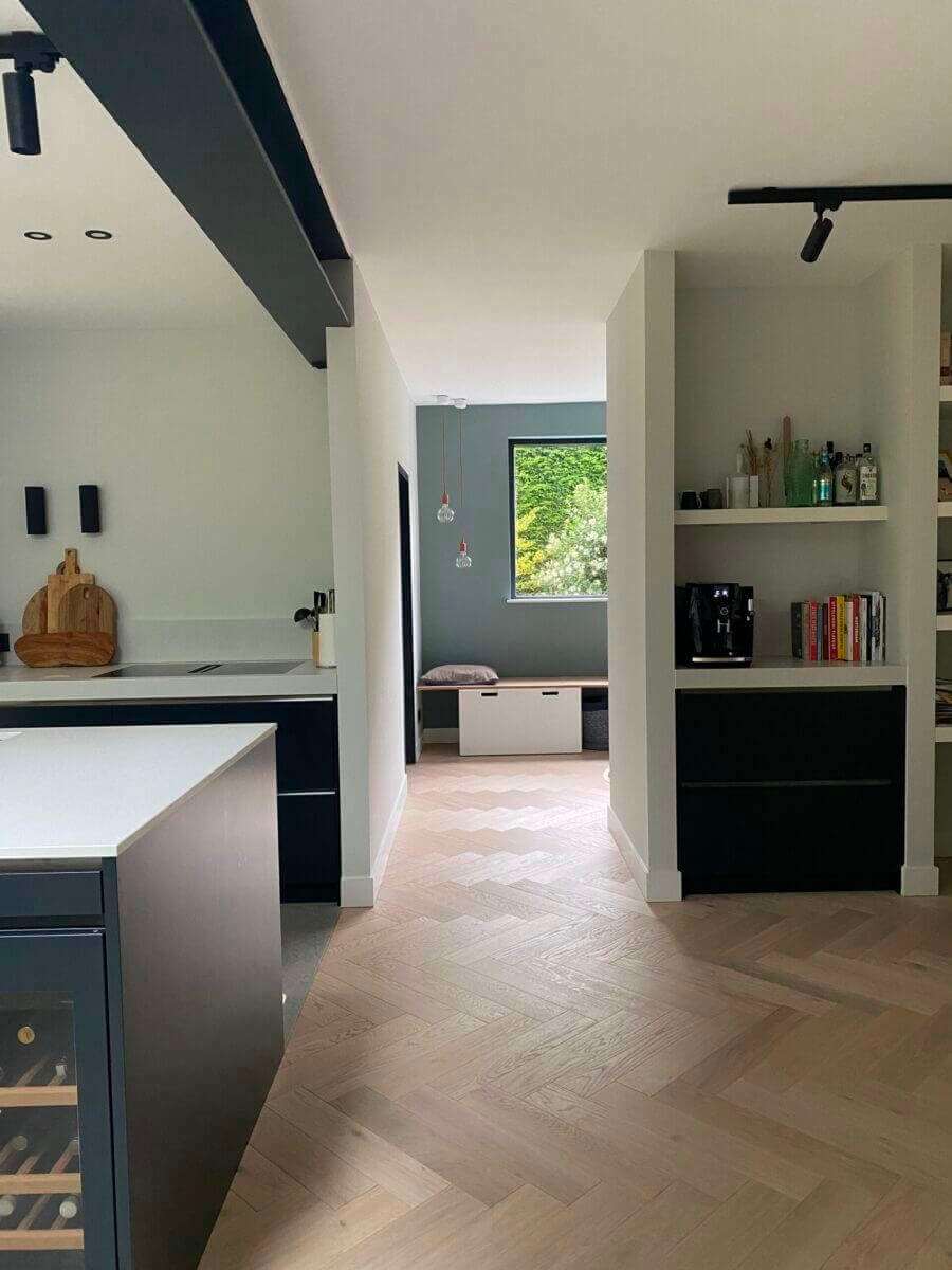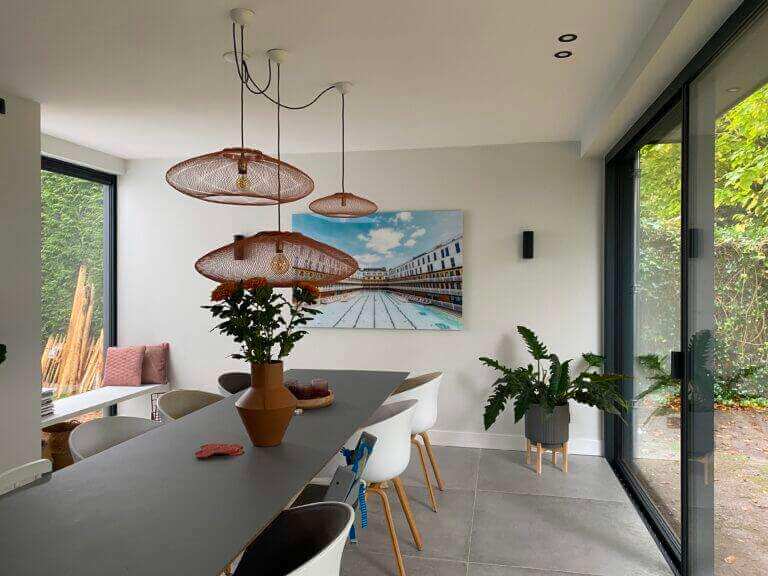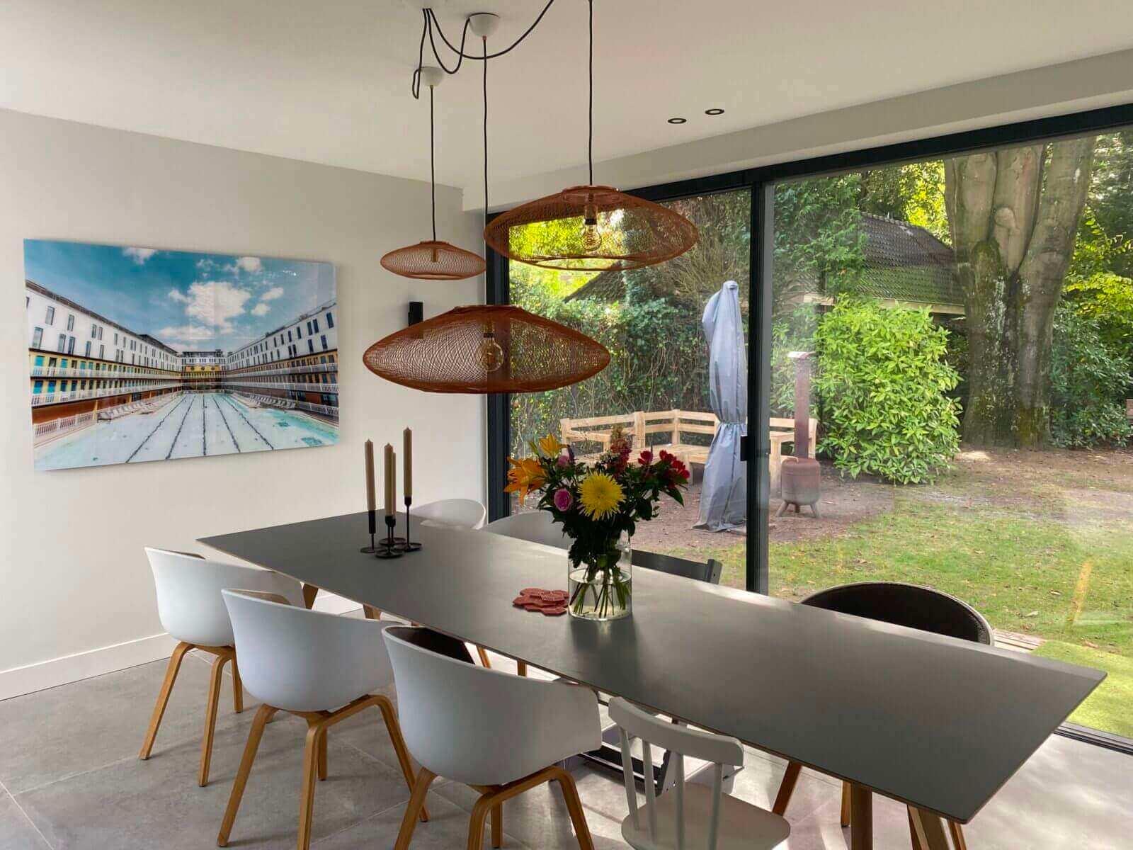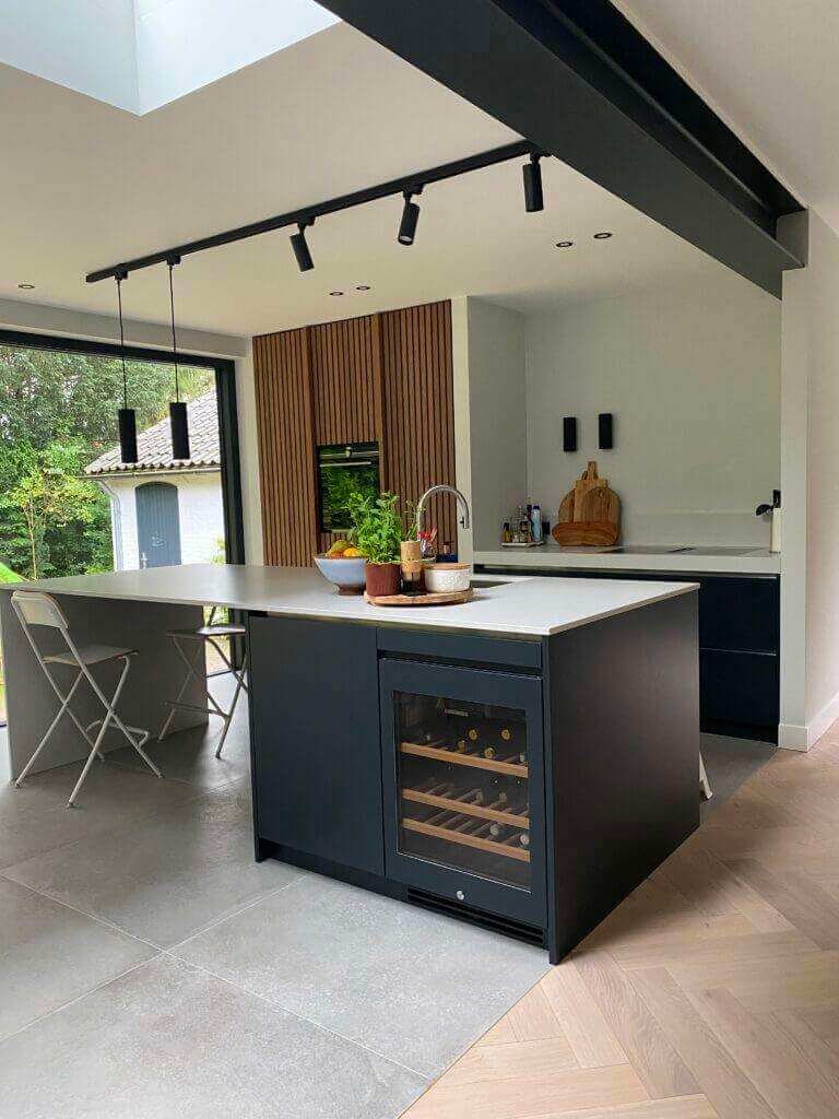 De woonkamer staat in open verbinding met de royale eetkamer met ruimte voor een lange eetkamertafel en een fantastische open keuken. De moderne luxe keuken is uitgevoerd met een spoeleiland inclusief ontbijtbar. Het kookgedeelte is voorzien van onder andere een vaatwasmachine, wijnkoelkast, grote inbouw koelkast, diepvriezer, oven, veel kastruimte, een natuurstenen aanrechtblad en een ‘cooker’. Koken doet u op de inductiekookplaat met ingebouwde afzuiging. Aansluitend aan de keuken heeft u toegang tot de nu in gebruik zijnde speelkamer, deze kan ook heel goed gebruikt worden als werkkamer/tv-kamer. Vanuit deze kamer komt u in de bijkeuken, ook te bereiken via de achterdeur. De bijkeuken is voorzien van inbouwkasten, de opstelling van de wasmachine en de droger en een stortgootsteen. Vanuit de woonkeuken, die over de gehele breedte is voorzien van een schuifpui die grotendeels open geschoven kan worden komt u op het terras waar genoeg ruimte is om met een goed gezelschap heerlijk te eten, borrelen of bijvoorbeeld lui onderuit te zitten in de lounge set.