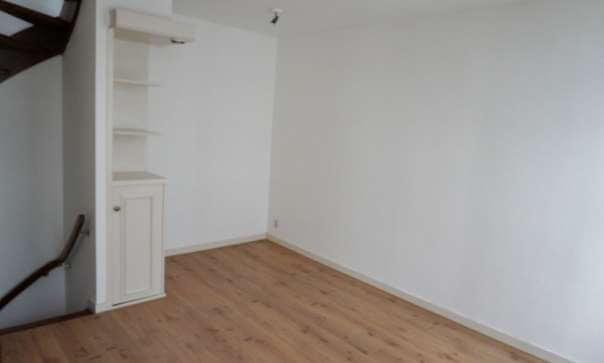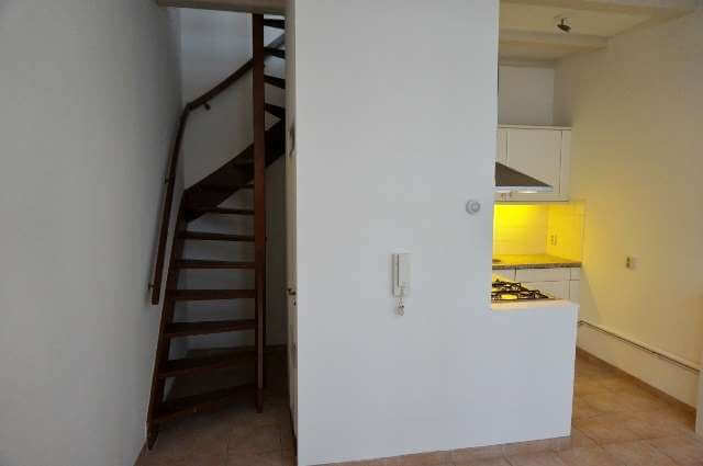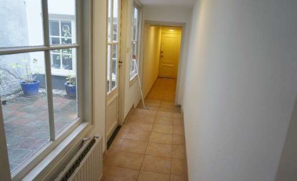 Een korte gang leidt naar het appartement met 3 verdiepingen. De woonkamer, woonkeuken en slaapkamer hebben zicht op buitenplaats en achterkant voorhuis.