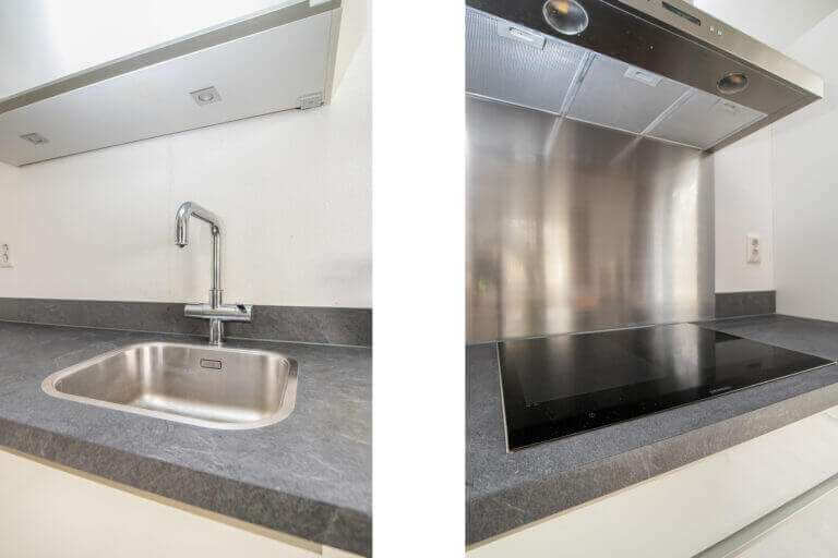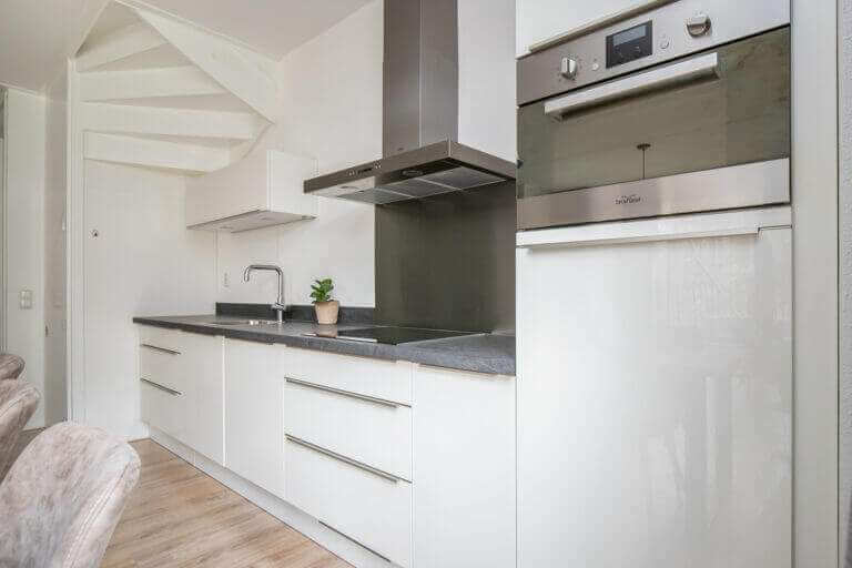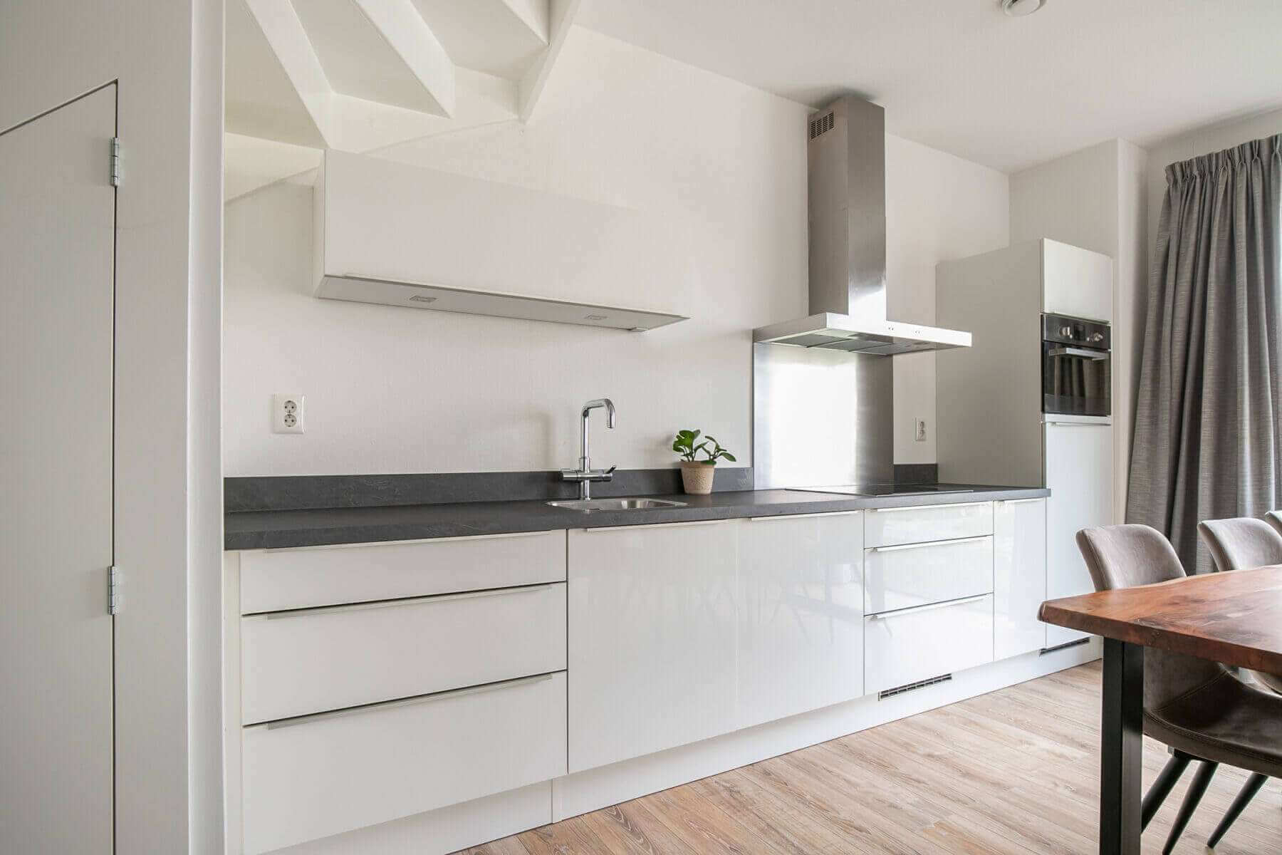 Entree, bijkeuken, toilet met fonteintje en meterkast. Als je doorloopt, kom je uit in de woonkamer. Deze is heerlijk licht vanwege de grote ramen. De moderne open keuken voorzien van diverse inbouwapparatuur waaronder afzuigkap, vaatwasser, combi-oven en inductie kookplaat. Middels een draai/kiepdeur in de woonkamer is de gezellige tuin aan de voorzijde te bereiken.