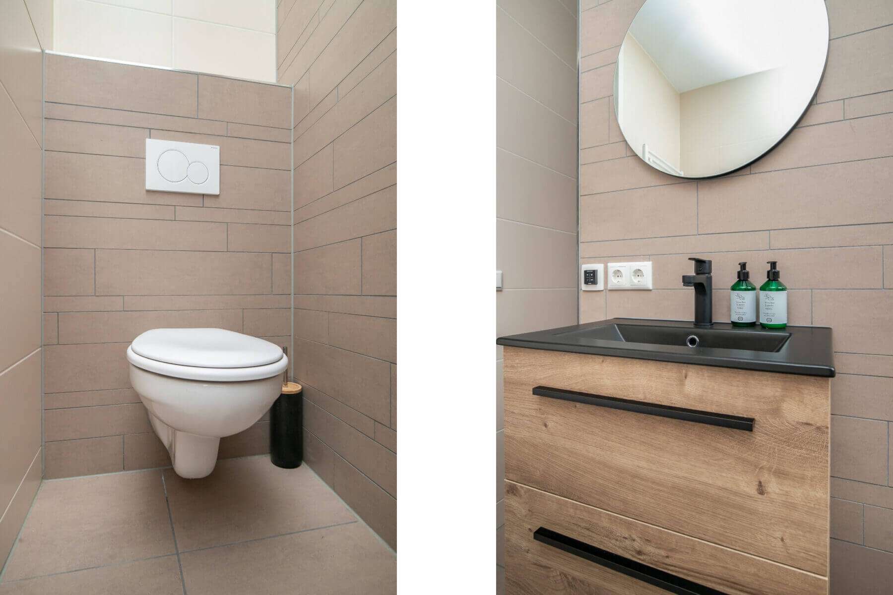 Via de trap kom je op de overloop van de eerste verdieping. Hier zijn de twee ruime slaapkamers, waarvan één is voorzien van inbouwkast. De moderne en luxe badkamer is voorzien van vloerverwarming, een inloopdouche, bad, tweede toilet en een wastafel.