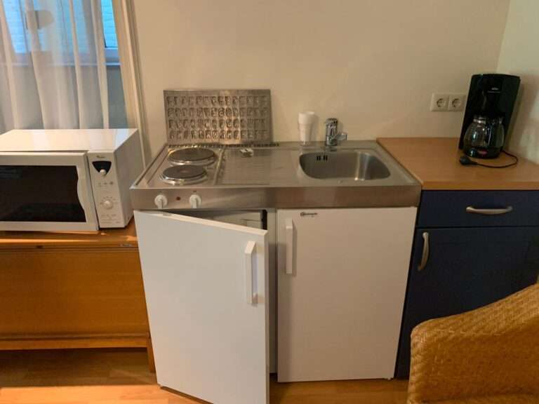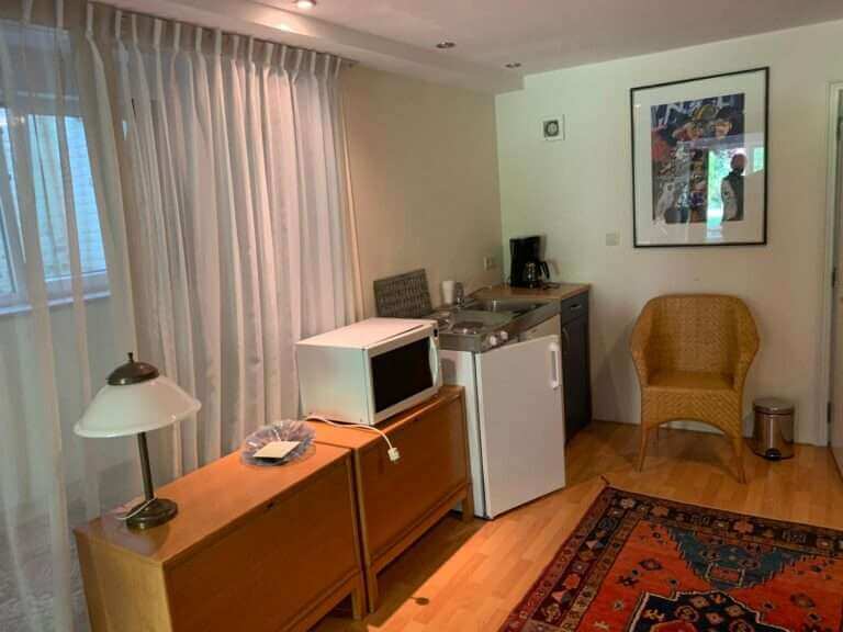 De ingang is via de tuinzijde waar een heerlijk zitje wordt gecreëerd op de zonzijde met volledige privacy, brengt je direct in de studio. een zit gedeelte met een bank en eettafel annex werkplek. De kitchenette is voorzien van een koelkast met vriesvak, twee elektrische kookpitten, gootsteen en een magnetron.