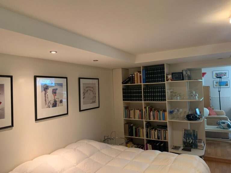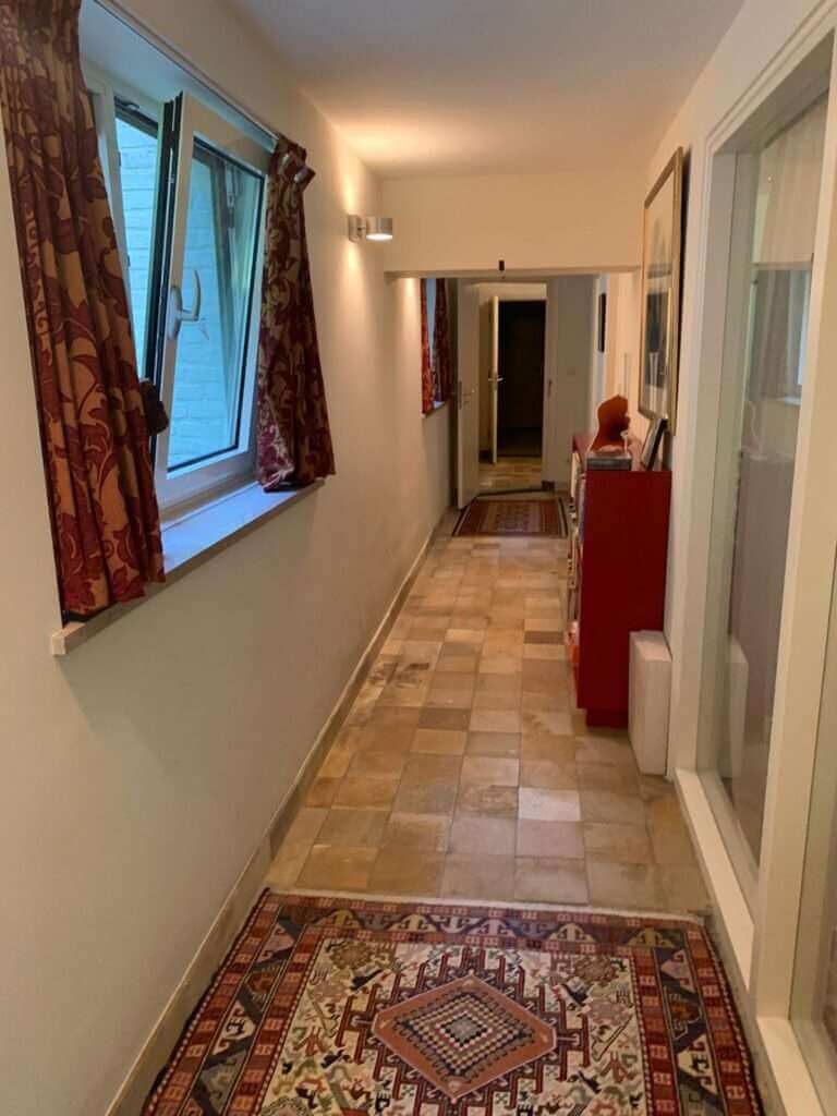 Via de woonkamer wordt de gang bereikt waar een ruime inloopkast is gesitueerd. De wasmachine en droger zijn gedeeld en gelegen in de kelderruimte achter de gang, dit is het woongedeelte van de eigenaar, gebruik hiervan in overleg.
