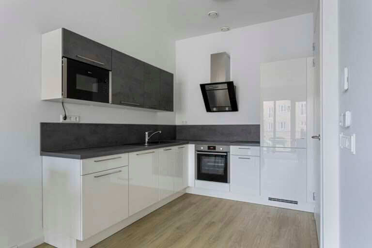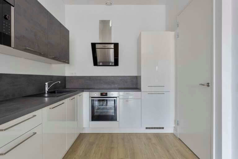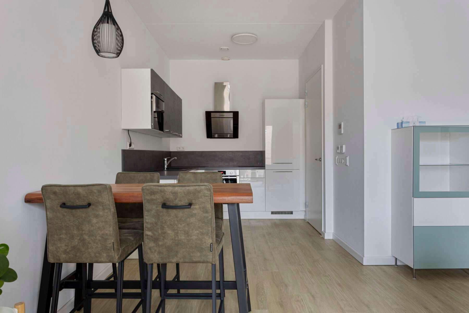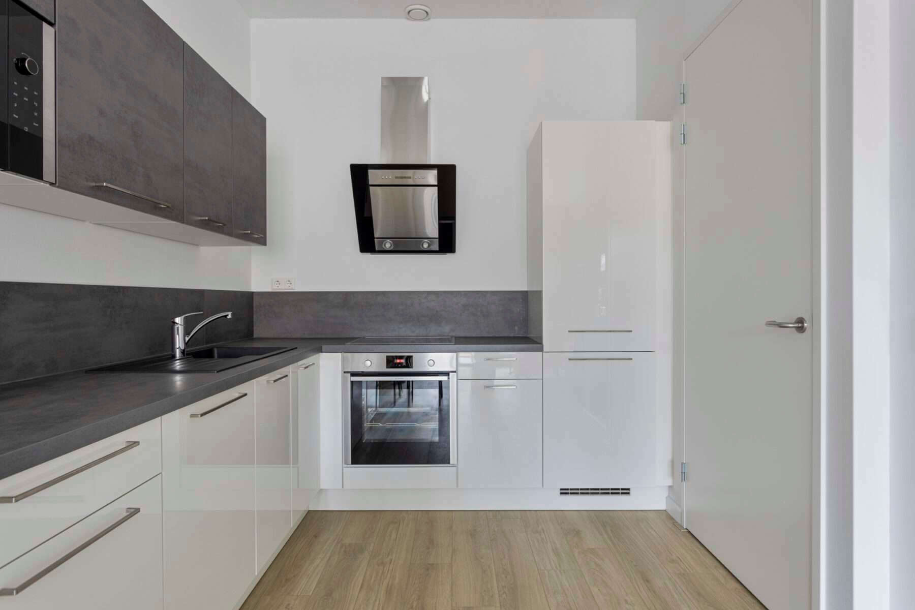 De nieuwe open keuken welke is voorzien van diverse inbouwapparatuur zoals een magnetron, oven en vaatwasser., inductiekookplaat met ruime voor 4 pannen en een afzuigkap.