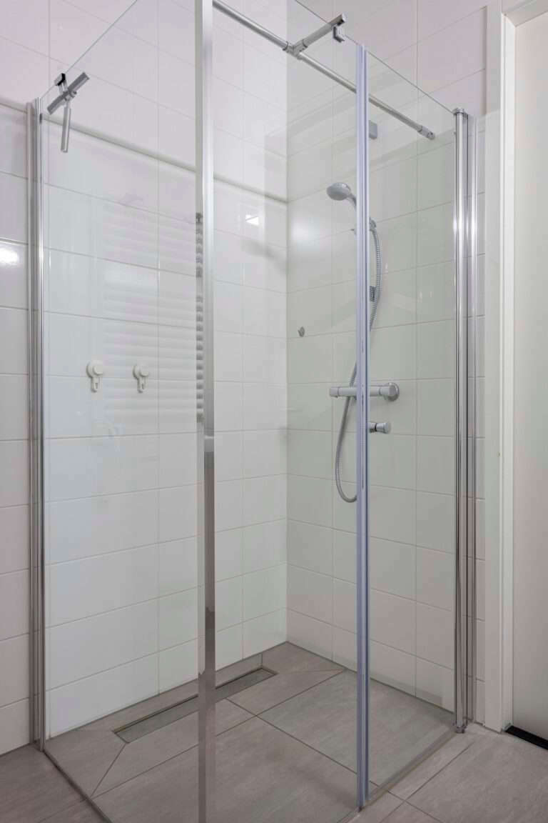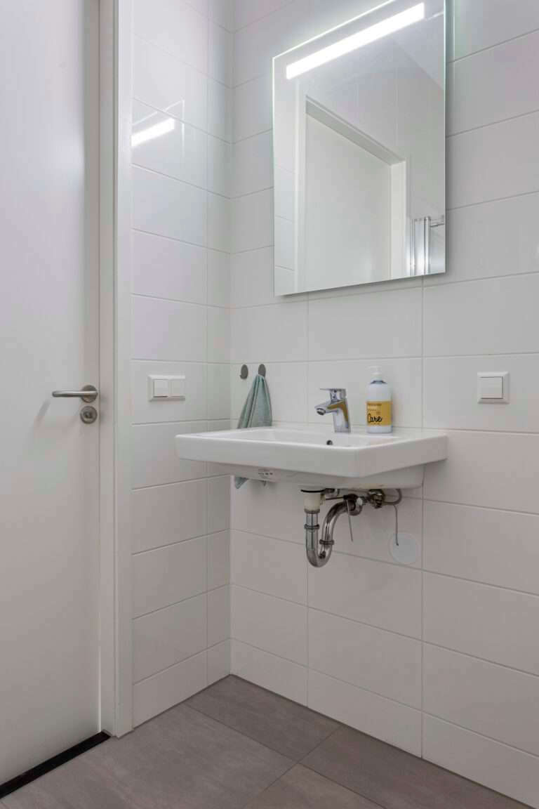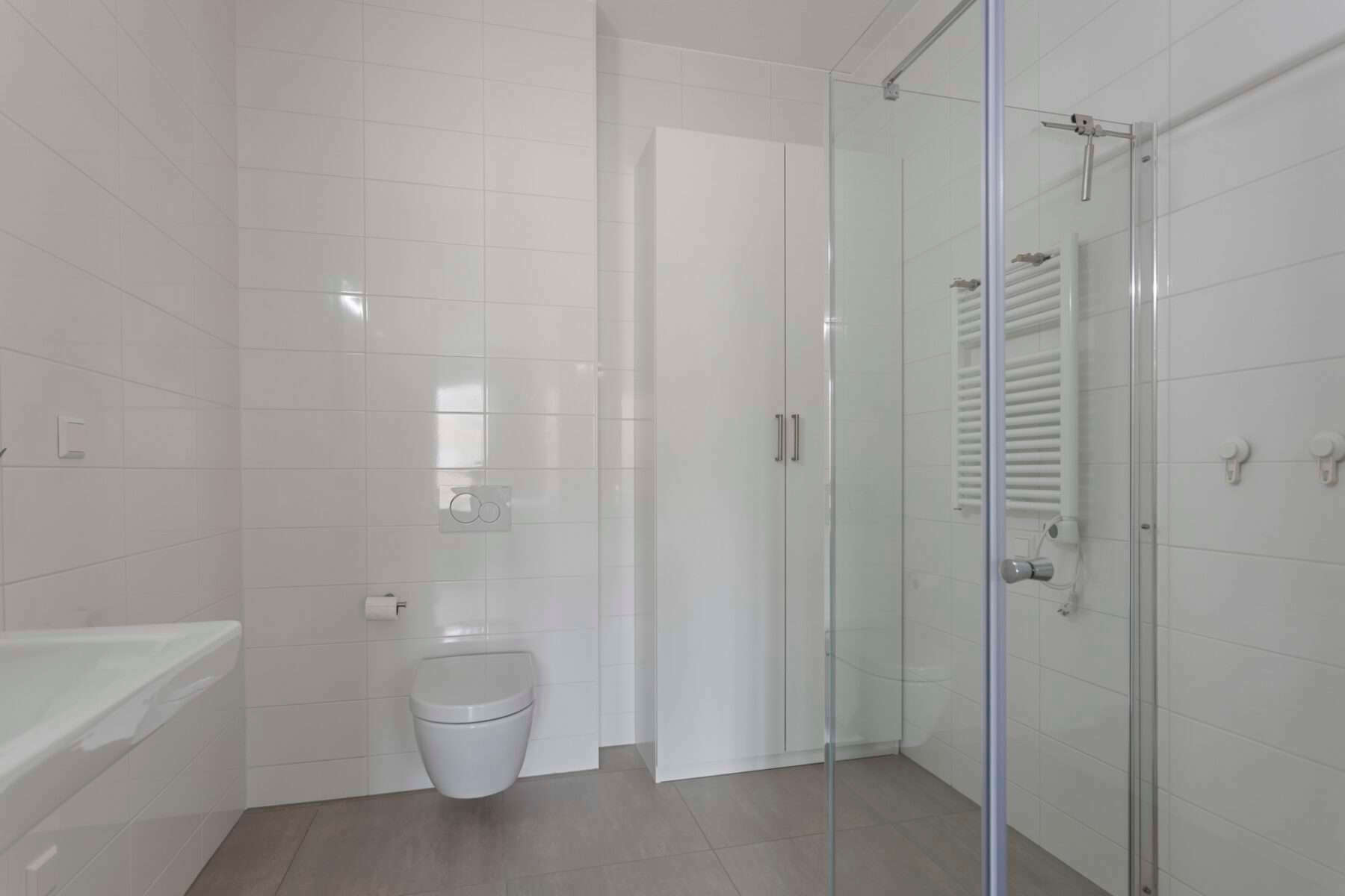 De ruime badkamer en suite is met zijn ruime douche, wastafel, designradiator en opbergruimte van alle gemakken voorzien.