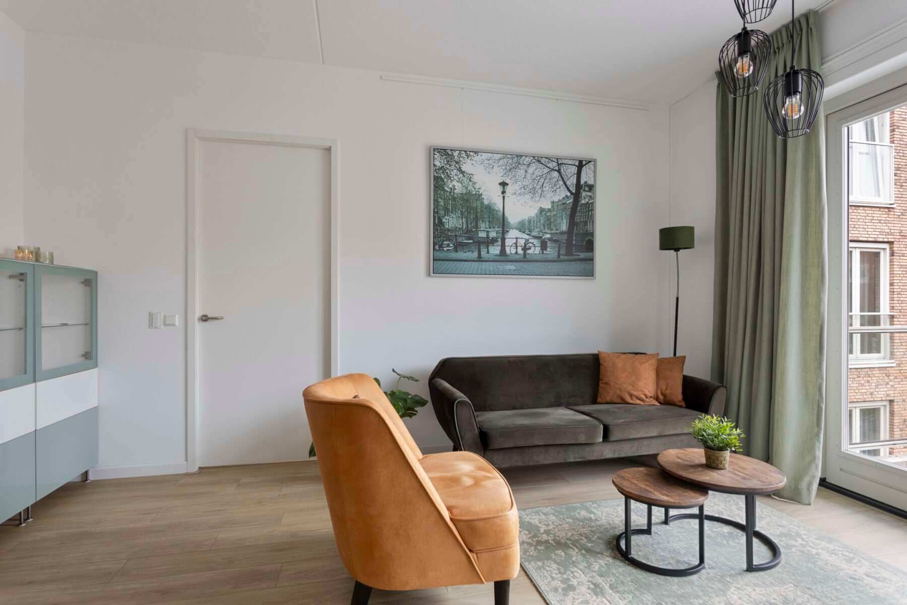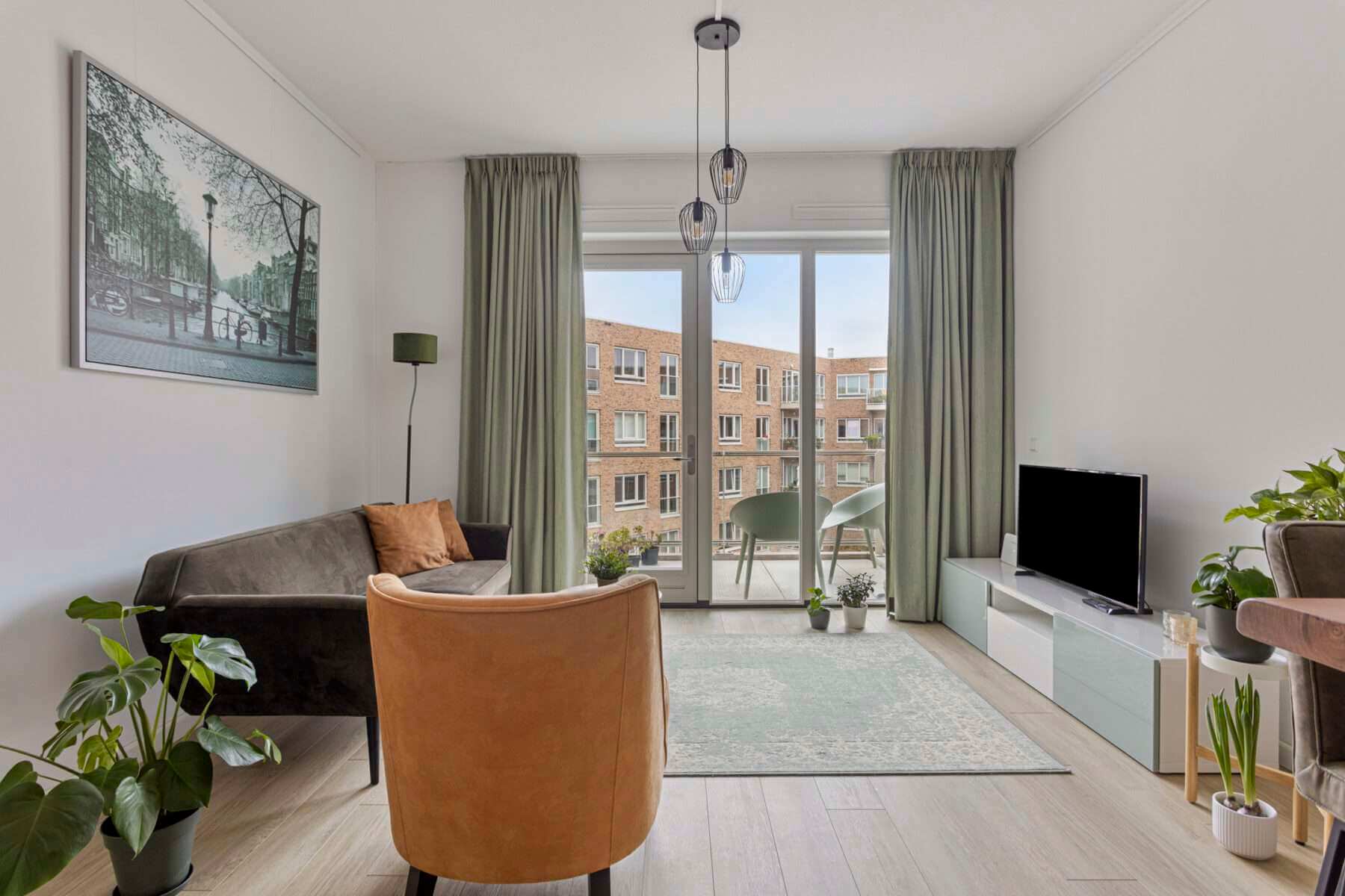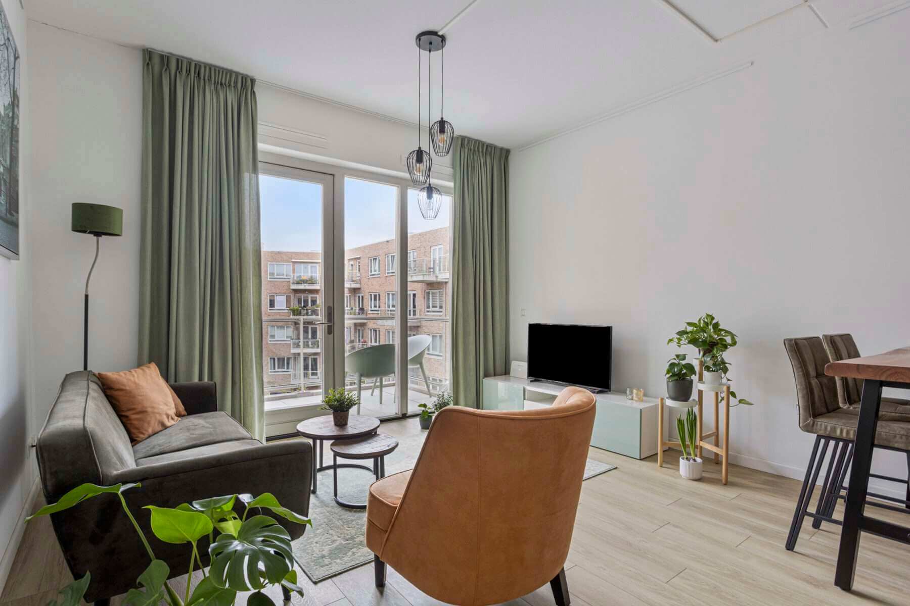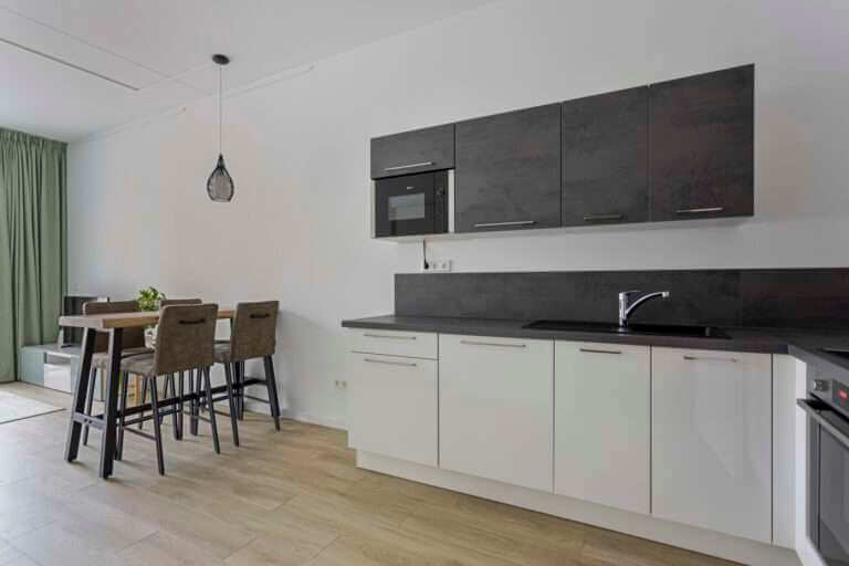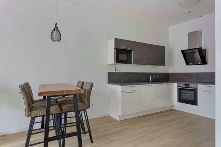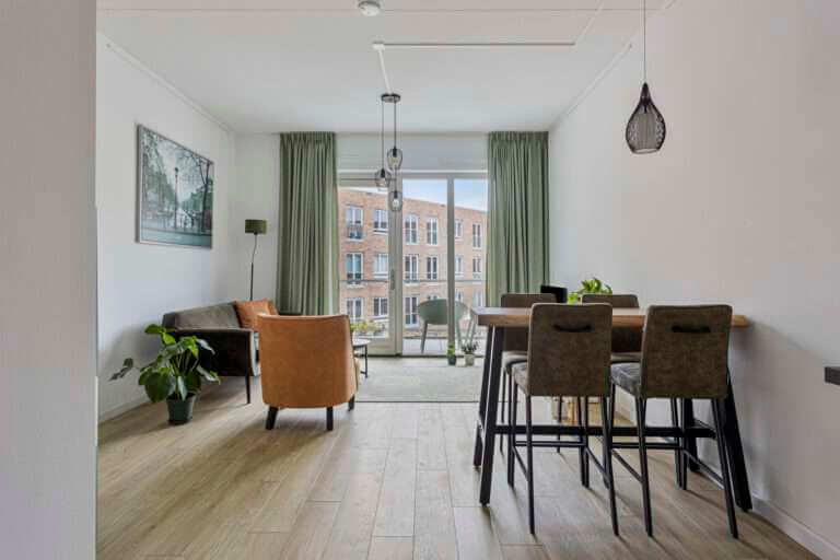 De woonkamer is heerlijk licht door de grote raampartij, waardoor je ook het balkon kunt betreden. De woon-/eetkamer is voorzien van nieuwe en moderne meubels.