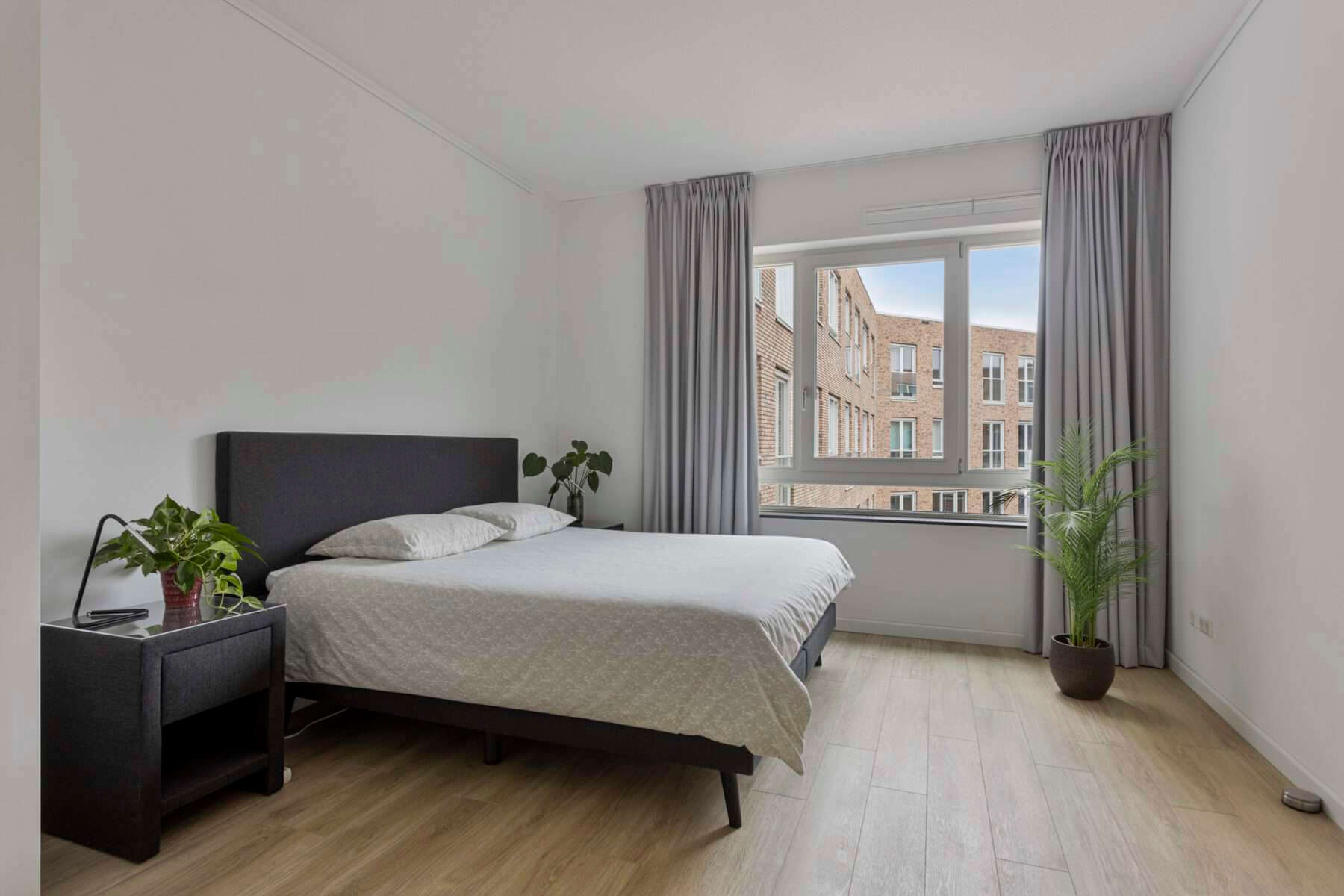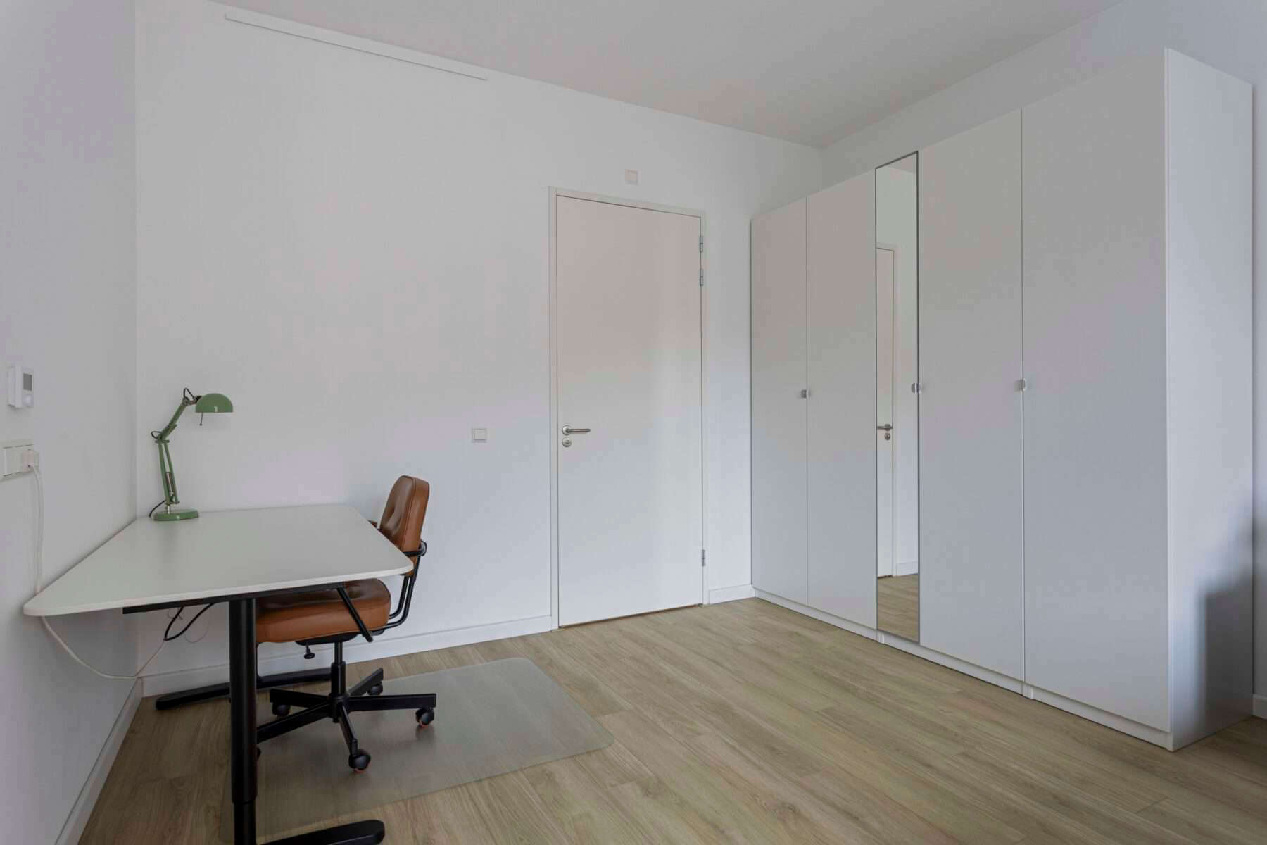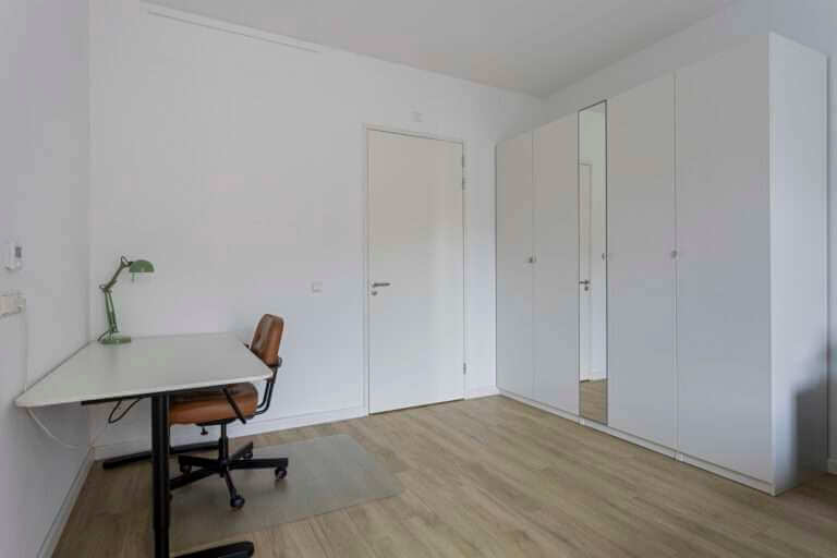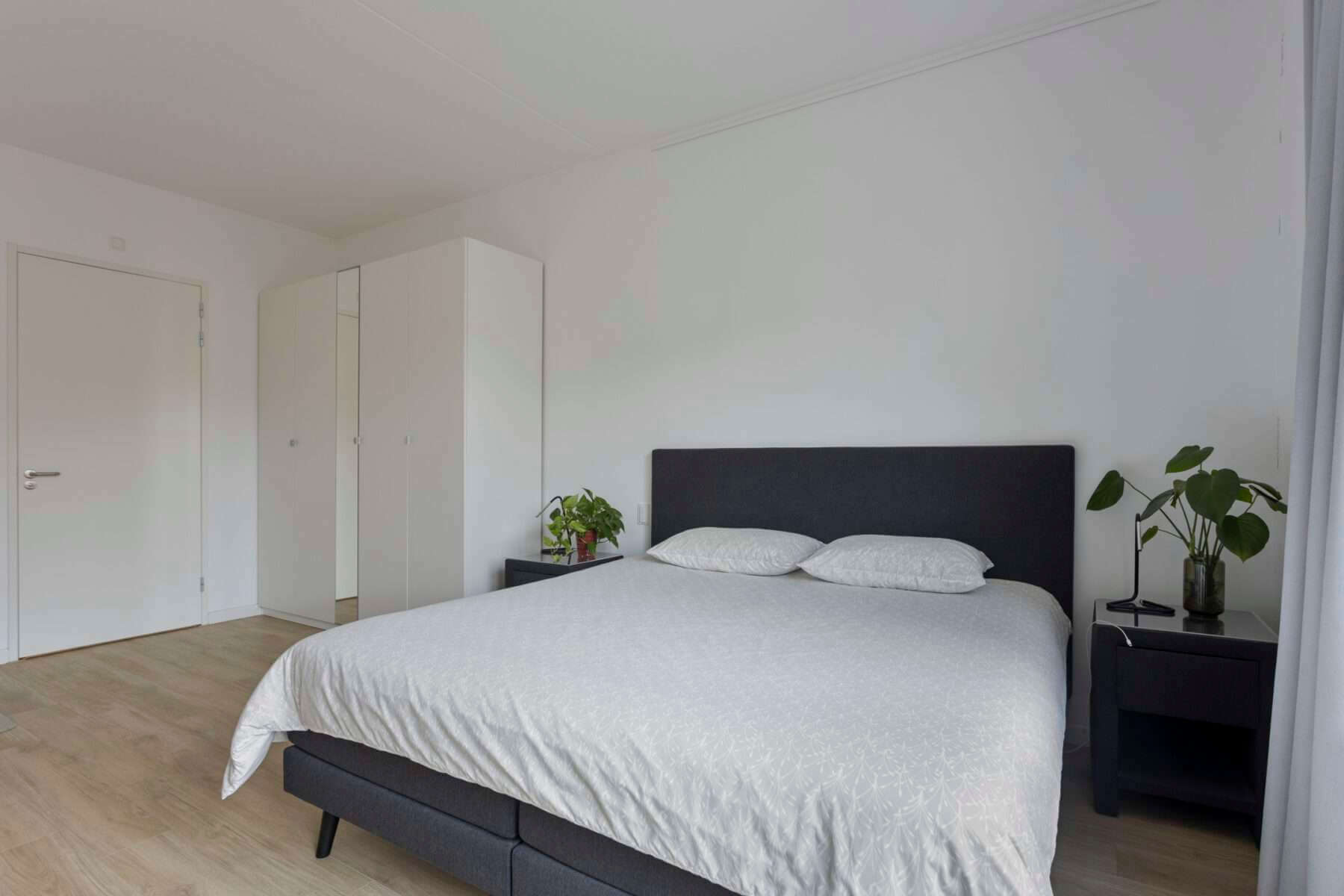 Via de woonkamer bereik je de enorm ruime slaapkamer, uitgerust met een nieuwe luxe Swiss Sense king size bed, een garderobekast en een bureau met ruimte om aan te werken.