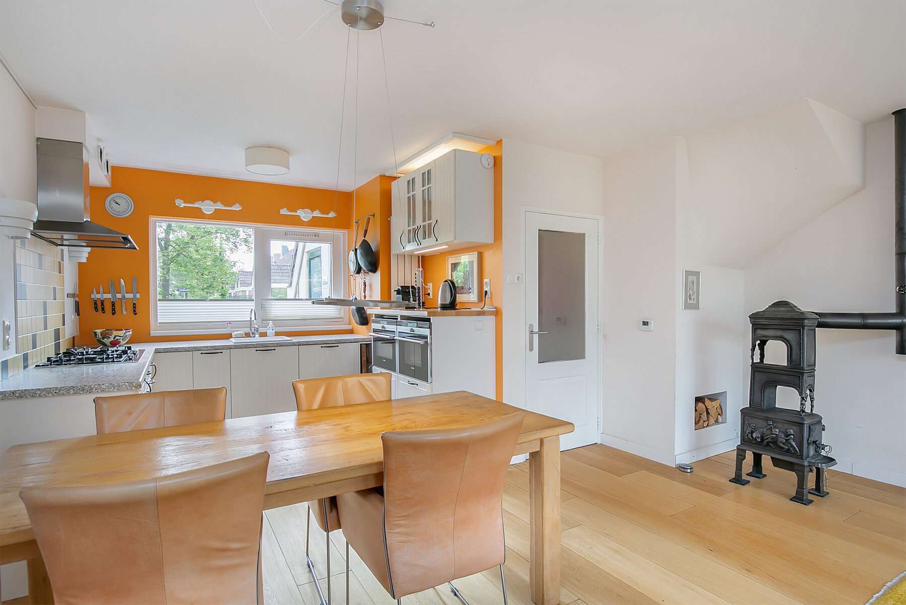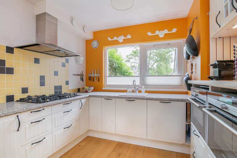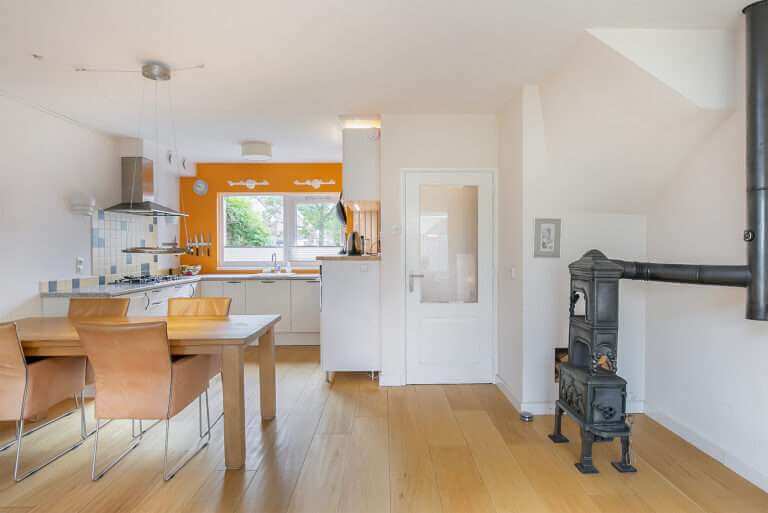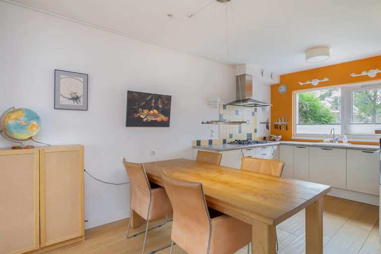 Op de begane grond vind je een ruime open keuken verbonden met de woonkamer. Via de woonkamer bereik je tuin. De keuken is voorzien van stoombakoven, combi stoombakoven, vaatwasser en grote koel-vriescombinatie.