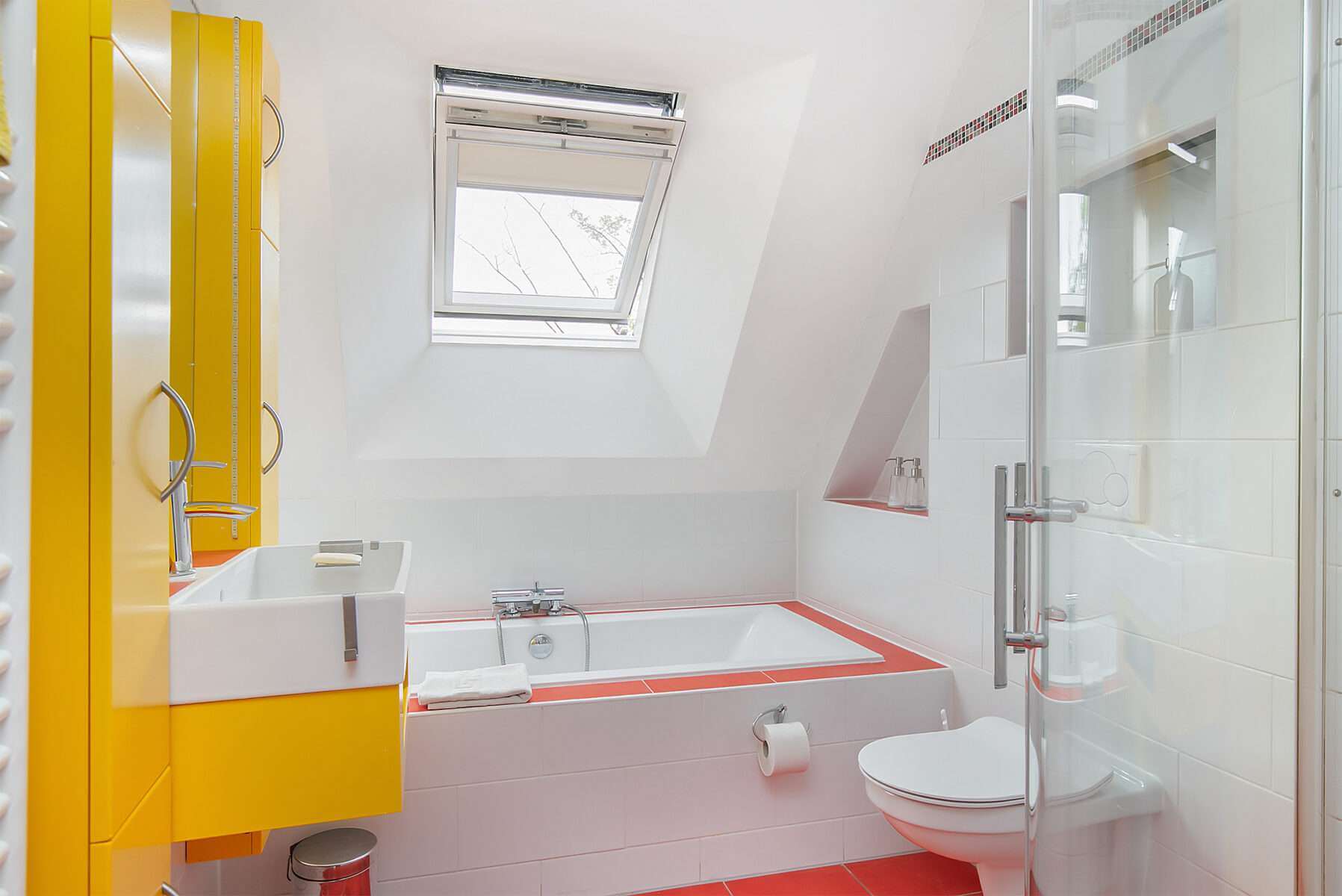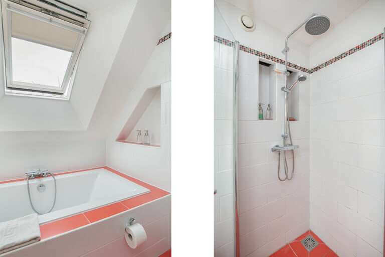 Op de eerste verdieping bevinden zich twee grote (slaap)kamers. De master bedroom heeft ingebouwde kledingkasten en een TV aan de muur. De andere kamer wordt momenteel gebruikt als kantoor, maar leent zich ook uitstekend voor een zeer ruime slaapkamer. Daarnaast vind je op de eerste verdieping een lichte badkamer met ligbad, inloopdouche en wastafelmeubel.