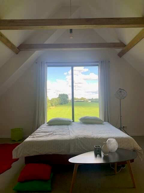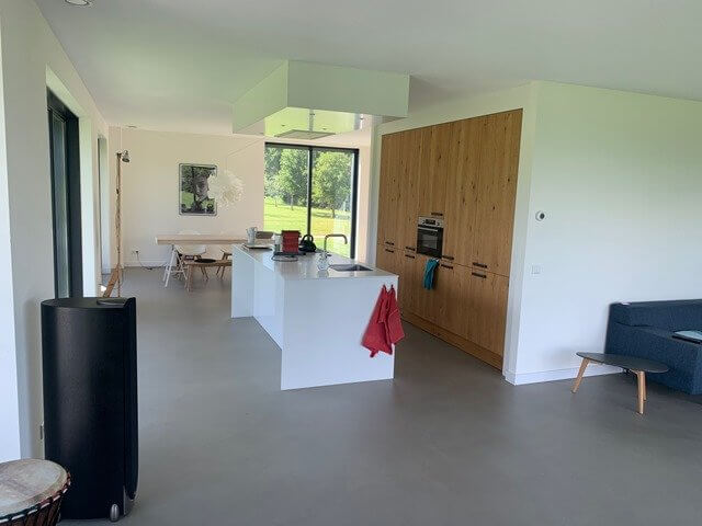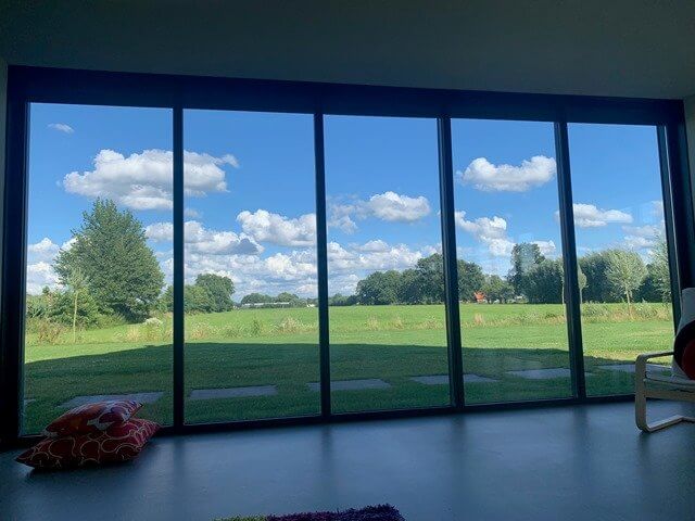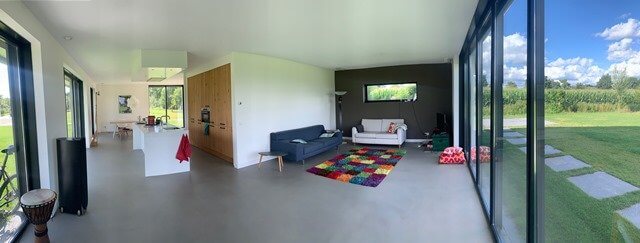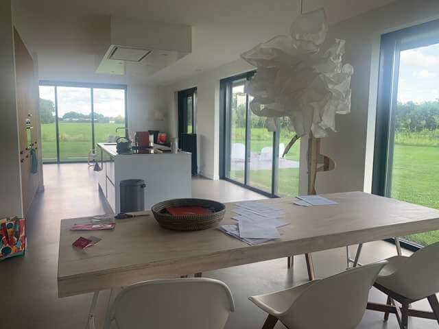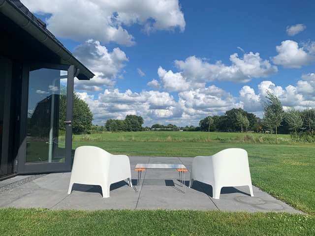 De woonkamer geeft een vrij uitzicht op de nieuw aangelegde tuin en aan de achterzijde op de uitgestrekte landerijen. De schuifpui aan de achterzijde geeft toegang tot de tuin en het terras.