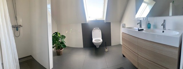 De badkamer is voorzien van een inloopdouche, een dubbele wastafel en een toilet. Deze is geheel betegeld.