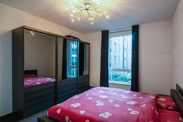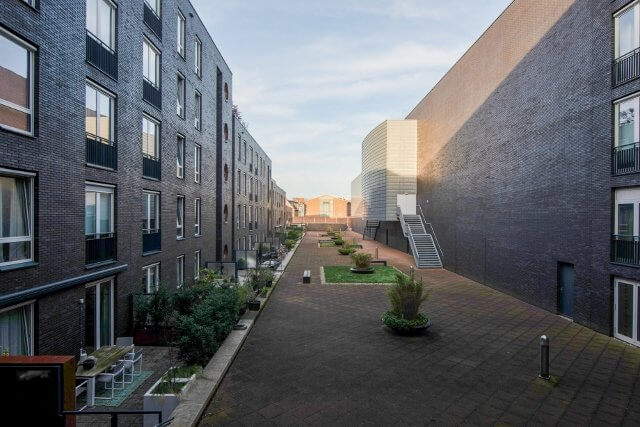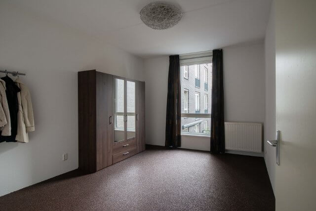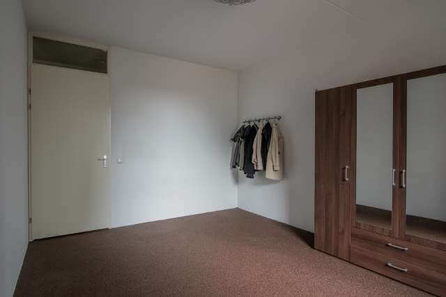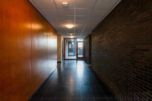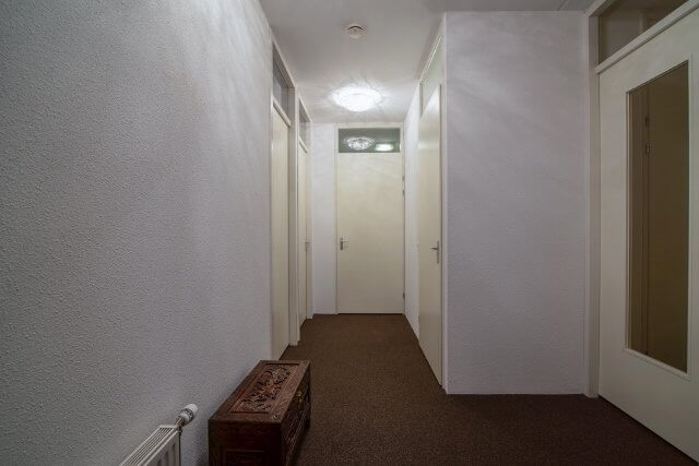 Entree, ruime hal met toegang tot 2 ruime gelijkwaardige slaapkamers (slaapkamer 1: 16m2 voorzien van een moderne grindvloer, slaapkamer 2: 18m2, voorzien van een luxe tapijt), beiden met uitzicht op de binnentuin van het complex.