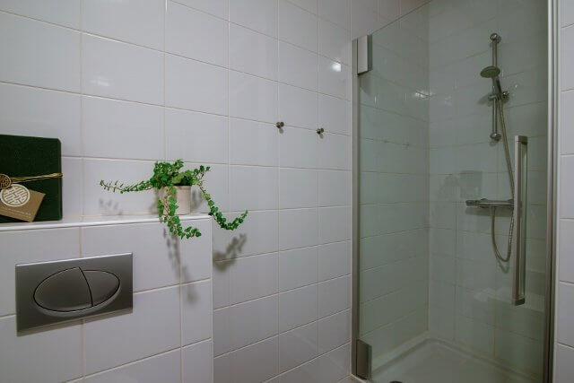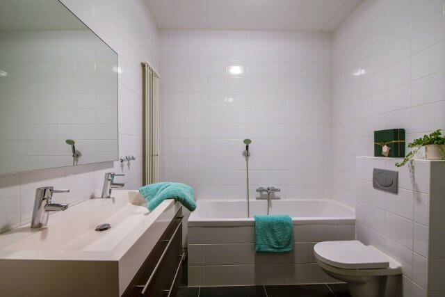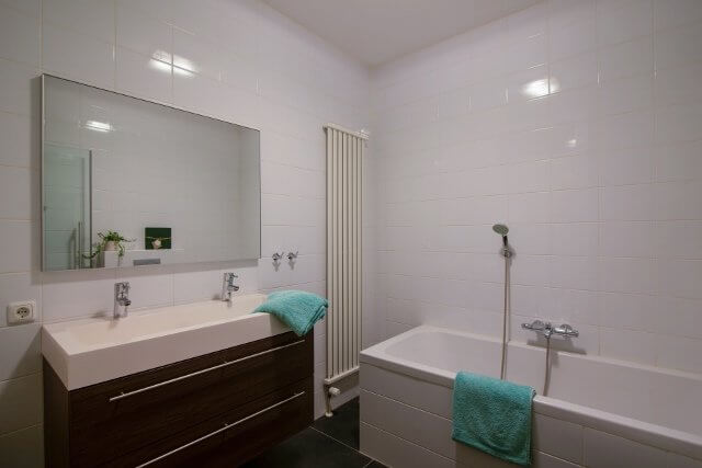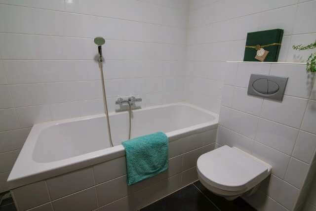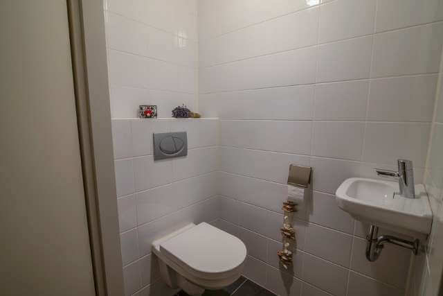 Een badkamer met design radiator, zwevend closet, ligbad, dubbele wastafel en inloop douche. Een separaat toilet met zwevend closet, fonteintje en ventilatie.