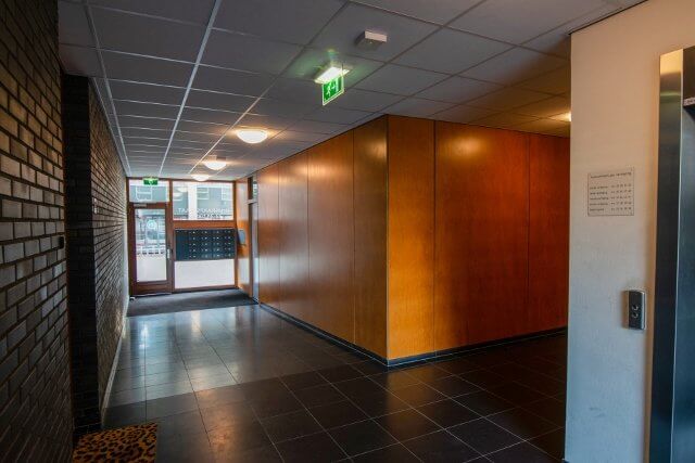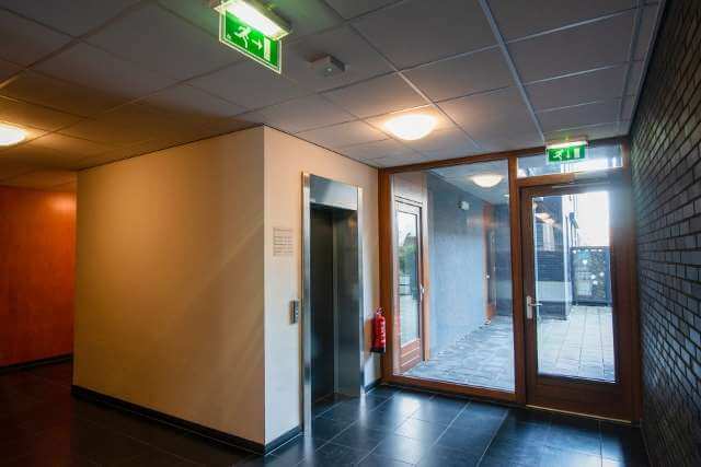 Hoofdentree met postbussen en lift naar de verdiepingen.