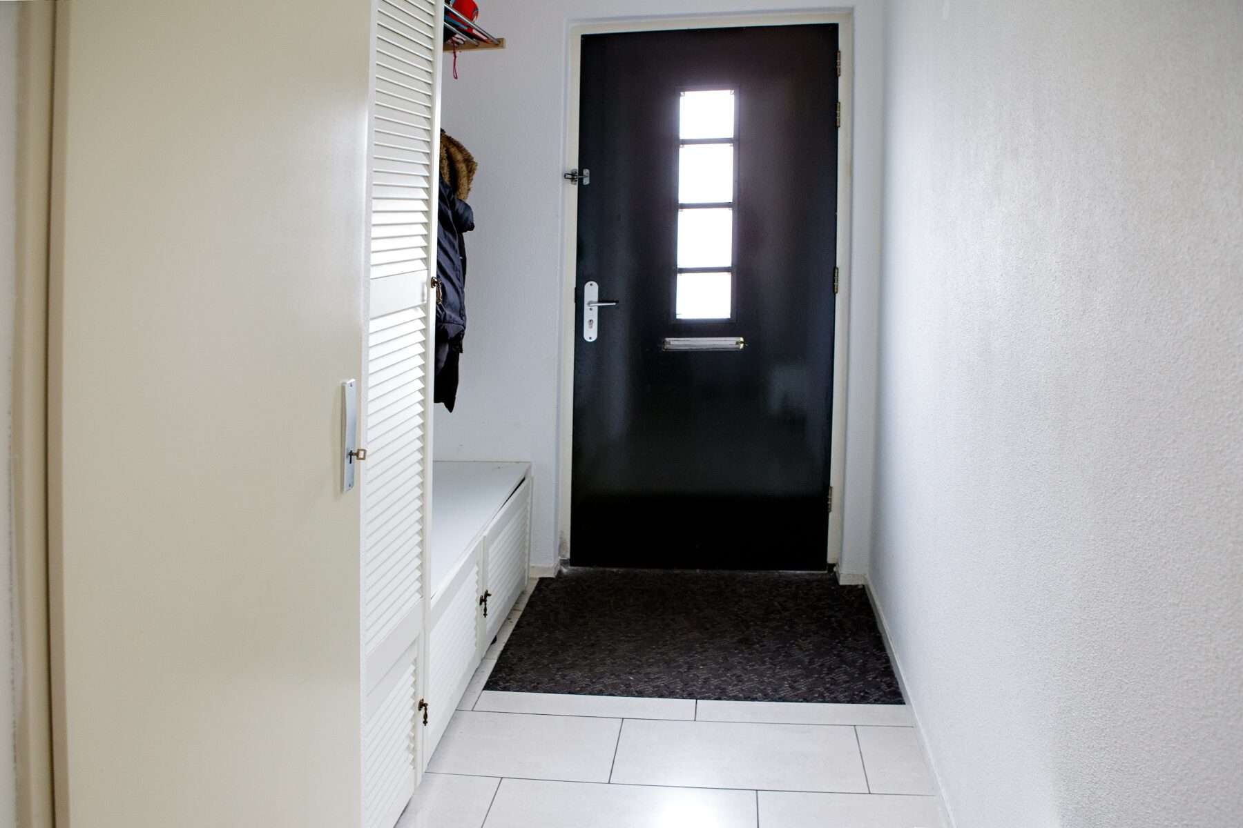 Entreehal met toegang, trap naar verdieping en woonkamer. Vanuit de woonkamer toegang tot een tussenhal naar het toilet en tot de keuken en tuin met berging aan de achterzijde.