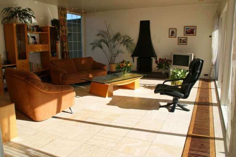 Entree met tochtportaal met toegang tot toilet en garage. Via tochtportaal toegang tot woonkeuken. Vanuit de keuken toegang tot enerzijds de woonkamer met openhaard en anderzijds het slaapgedeelte met 2 slaapkamers met elk een eigen badkamer.