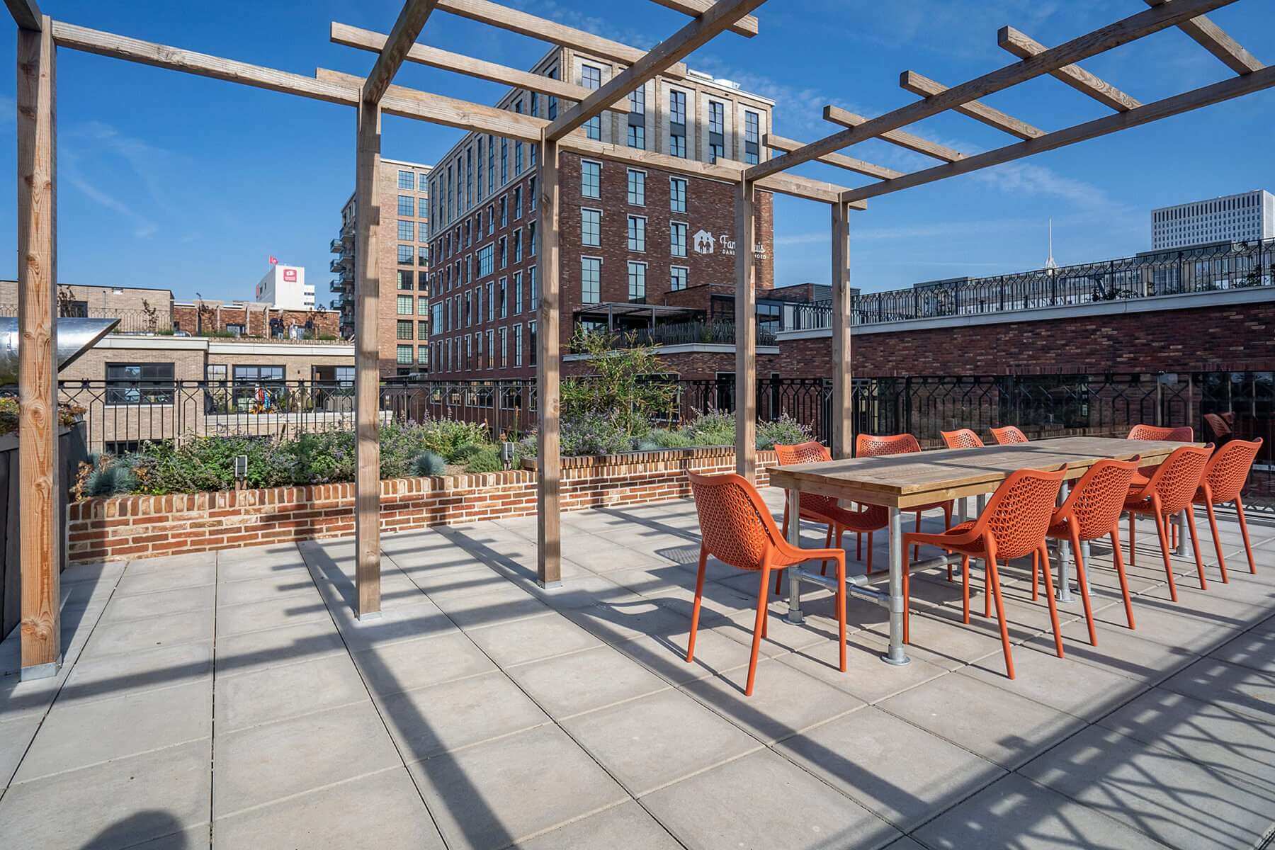 ‘s-Ochtends heerlijk ontbijten in de ochtendzon op uw balkon en ‘s-avonds gezellig borrelen op het gemeenschappelijke dakterras met uw medebewoners van uw cluster.