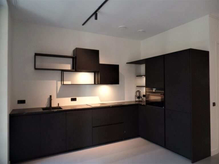 De luxe open keuken in donkere kleurstelling beschikt over een inductiekookplaat met afzuiging, koelkast, vriezer, combi-oven en vaatwasser.