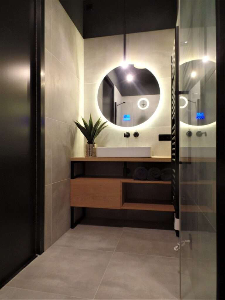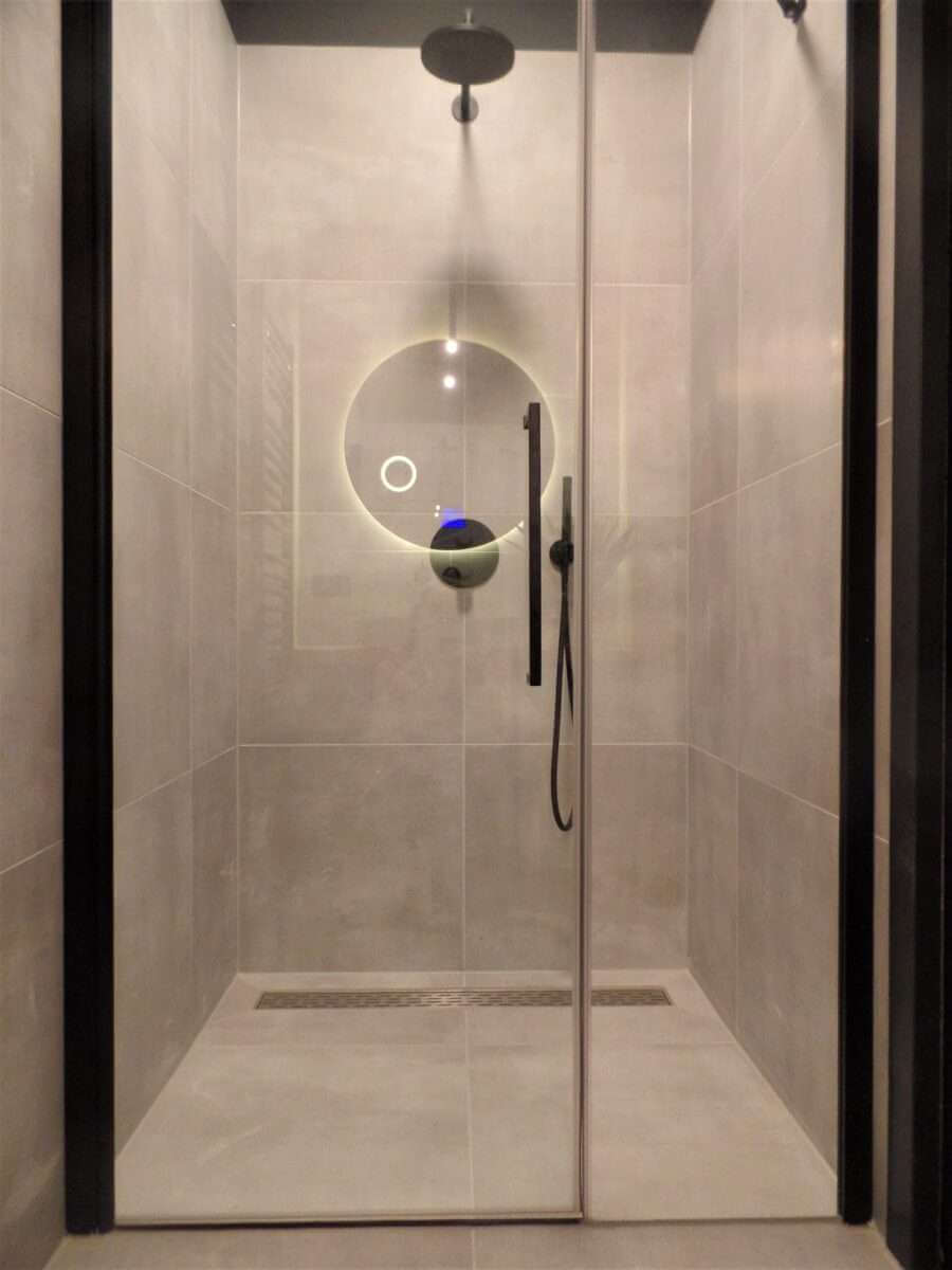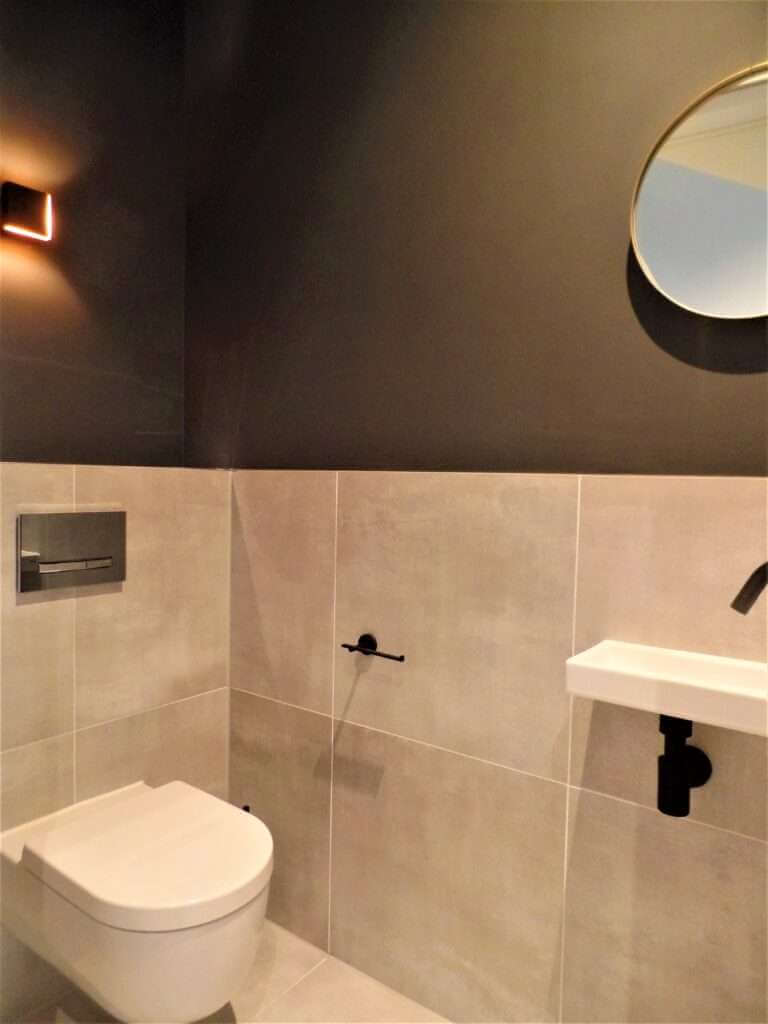 De badkamer is volledig betegeld en heeft mooie grote licht grijze tegels. Op de vloer liggen eveneens mooie licht grijze tegels. Hier ziet u ook dezelfde sfeer terug als in de rest van de woning. De badkamer is voorzien van een douchecabine met regendouche en een wastafelmeubel met spiegel.