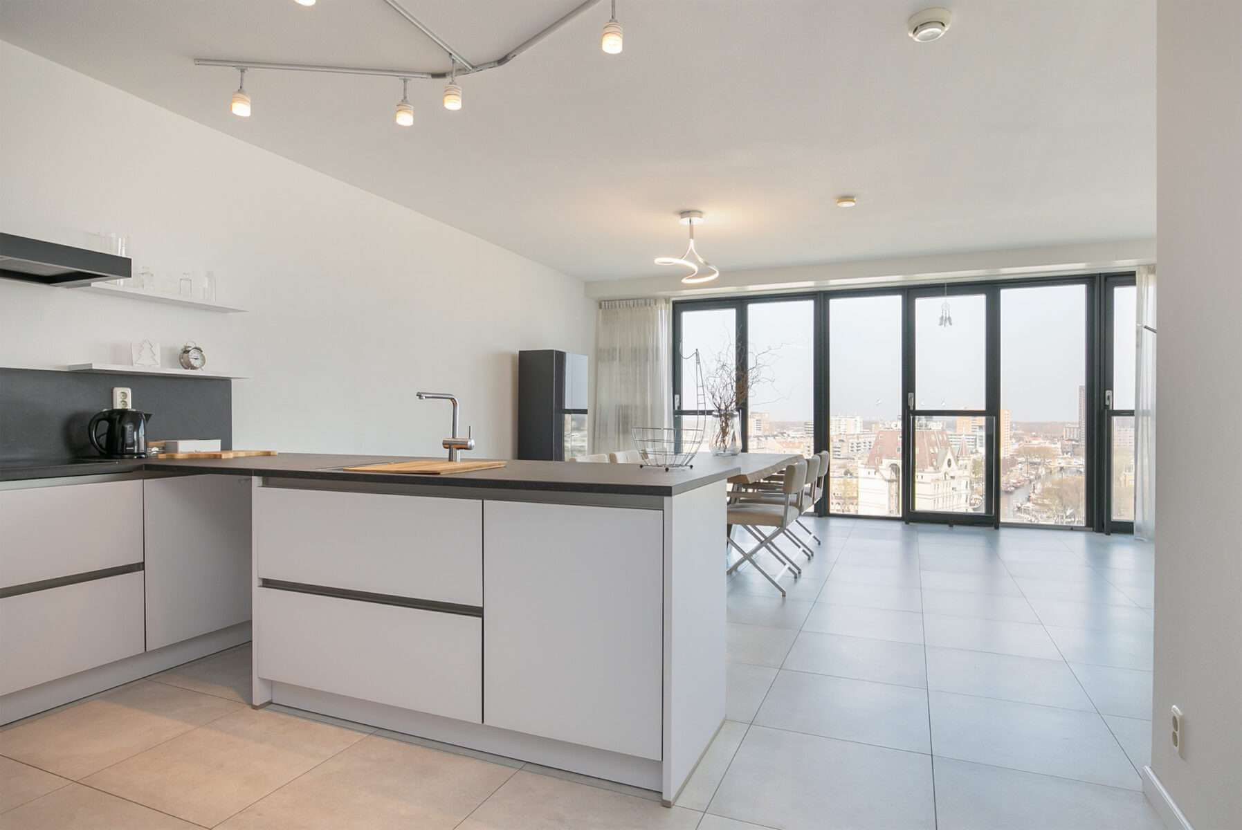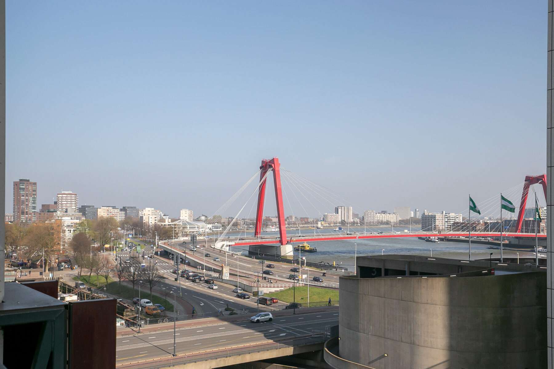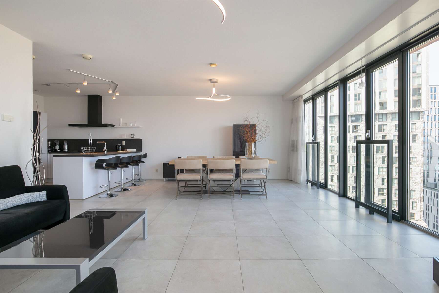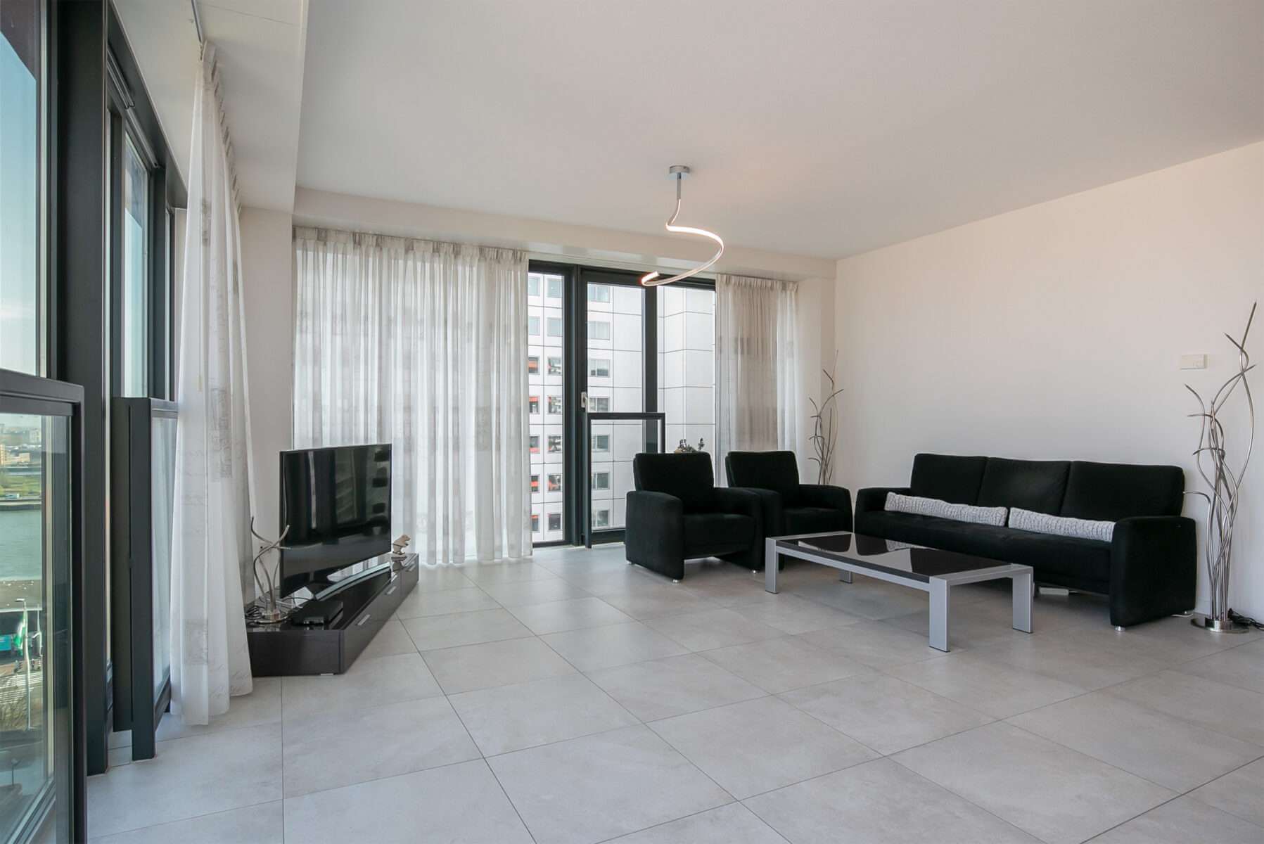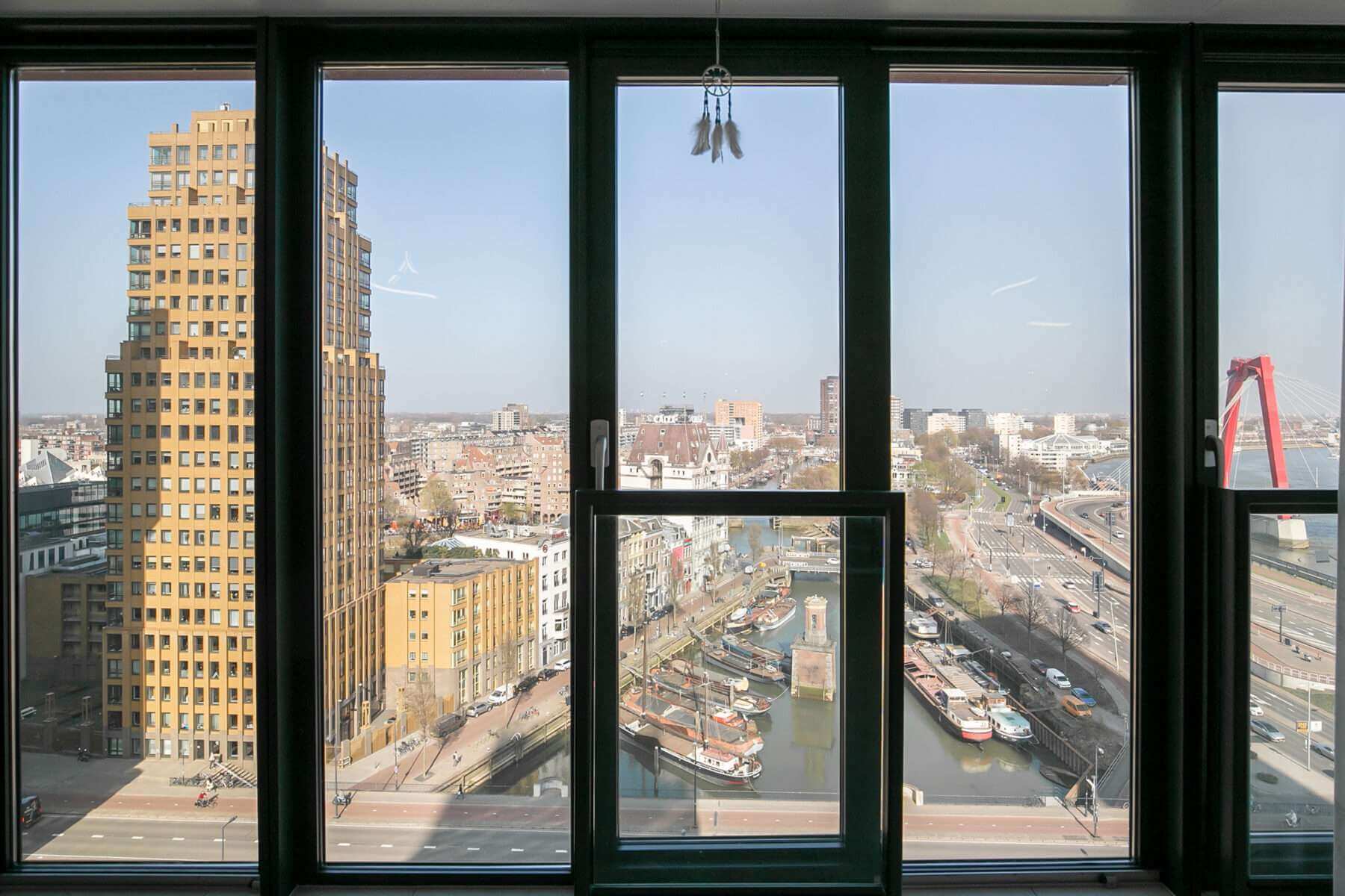 Vanuit de L-vormige entree zijn de verschillende vertrekken te bereiken. Bij binnenkomst in het leefgedeelte staat u direct versteld van het schitterende uitzicht over de ”Wijnhaven””, het Witte Huis” en de Willemsbrug! De hoge raampartijen over de gehele breedte zorgen voor een perfecte uitkijk én een fijne lichtinval. Bij prachtig weer kunt u gebruik maken van de gemeenschappaelijke tuin op de 14e verdieping van het appartementencomplex en zijn in de woonkamer de raampartijen met franse balkons te openen, waardoor u een aparte buitenruimte zeker niet zult missen. Door de open en praktische indeling is de living een fijne plek waar alles samenkomt. Een heerlijke zit- en eethoek waar gezelligheid en ontspanning hand in hand gaan. Ziet u uzelf hier al elke dag thuiskomen?