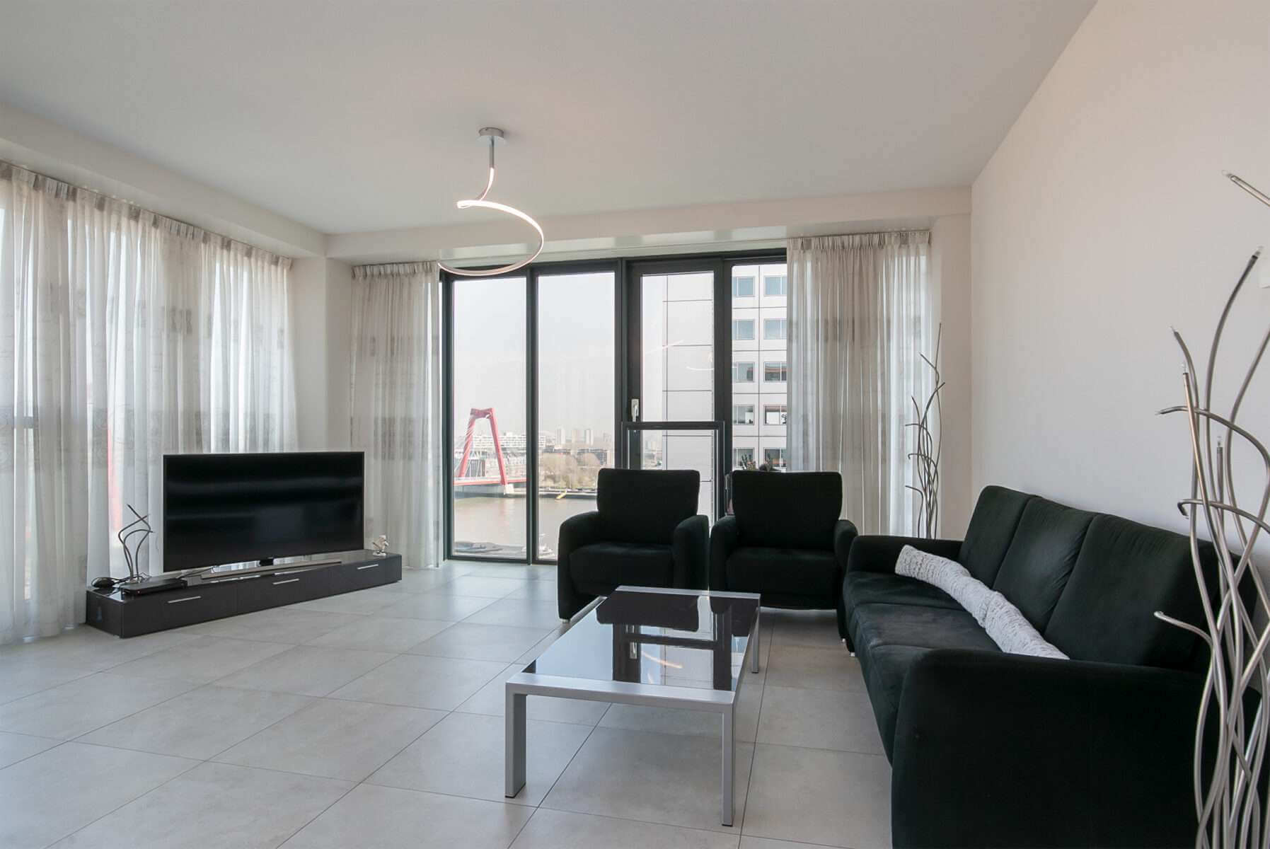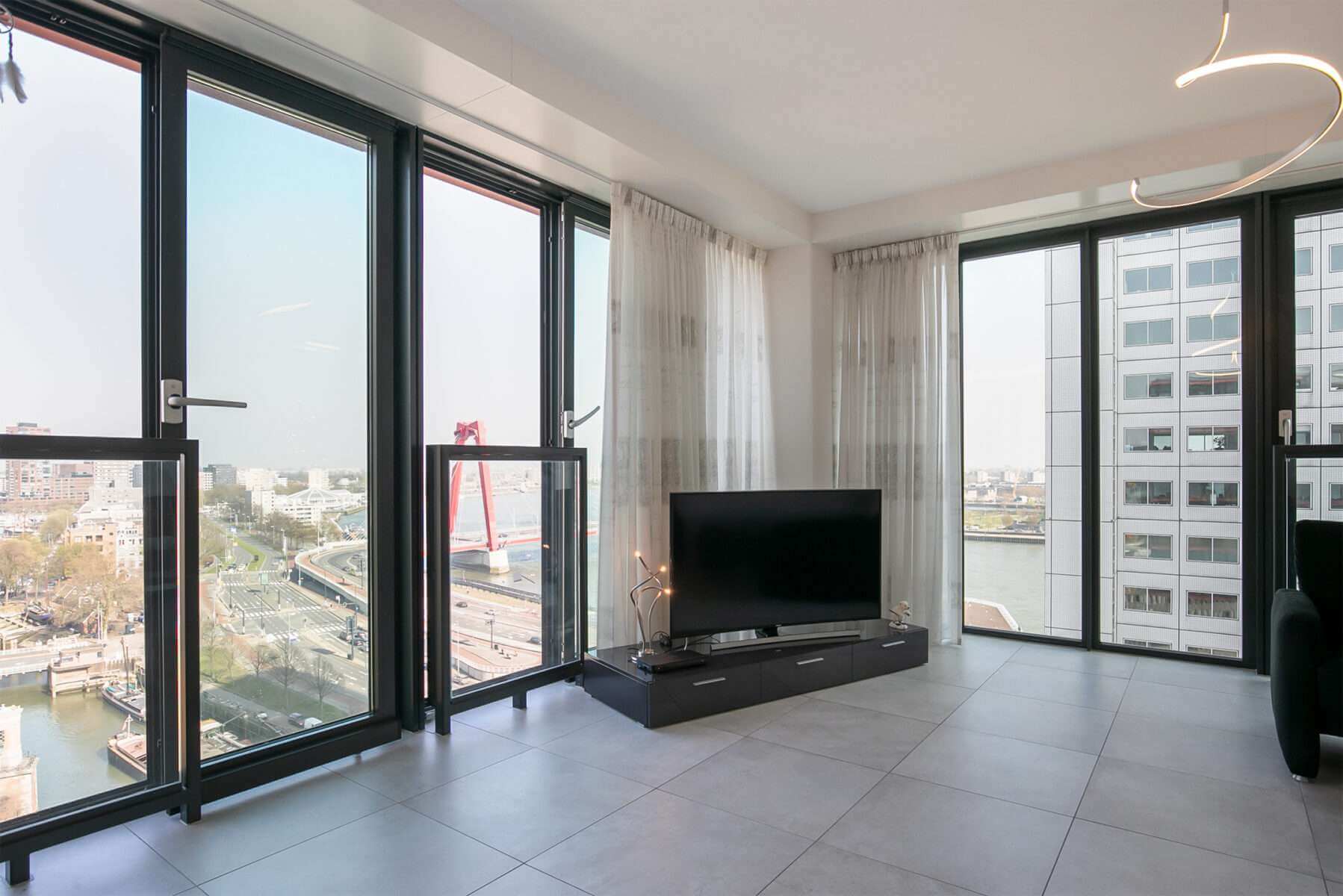 Wauw, wat een riant appartement is dit! Wonen op een toplocatie, in de bruisende Stadsdriehoek, met een fenomenaal uitzicht over de metropool Rotterdam! Dit moderne, luxieus afgewerkte, volledig gemeubileerde 3-kamer appartement bevindt zich op de 13e verdieping van het kopblok van de woontoren “”Red Apple”” en is voorzien van een prachtige, zeer ruime open keuken, twee zeer ruime slaapkamers, voorzien van veel kastruimte en een ruime lichte badkamer met douche, ligbad en wastafel. Uw auto parkeert u op het parkeerdek van het gebouw op uw eigen private parkeerplaats. Op de 14e verdieping kunt u gebruik maken van de gemeenschappelijke tuin van het gebouw.