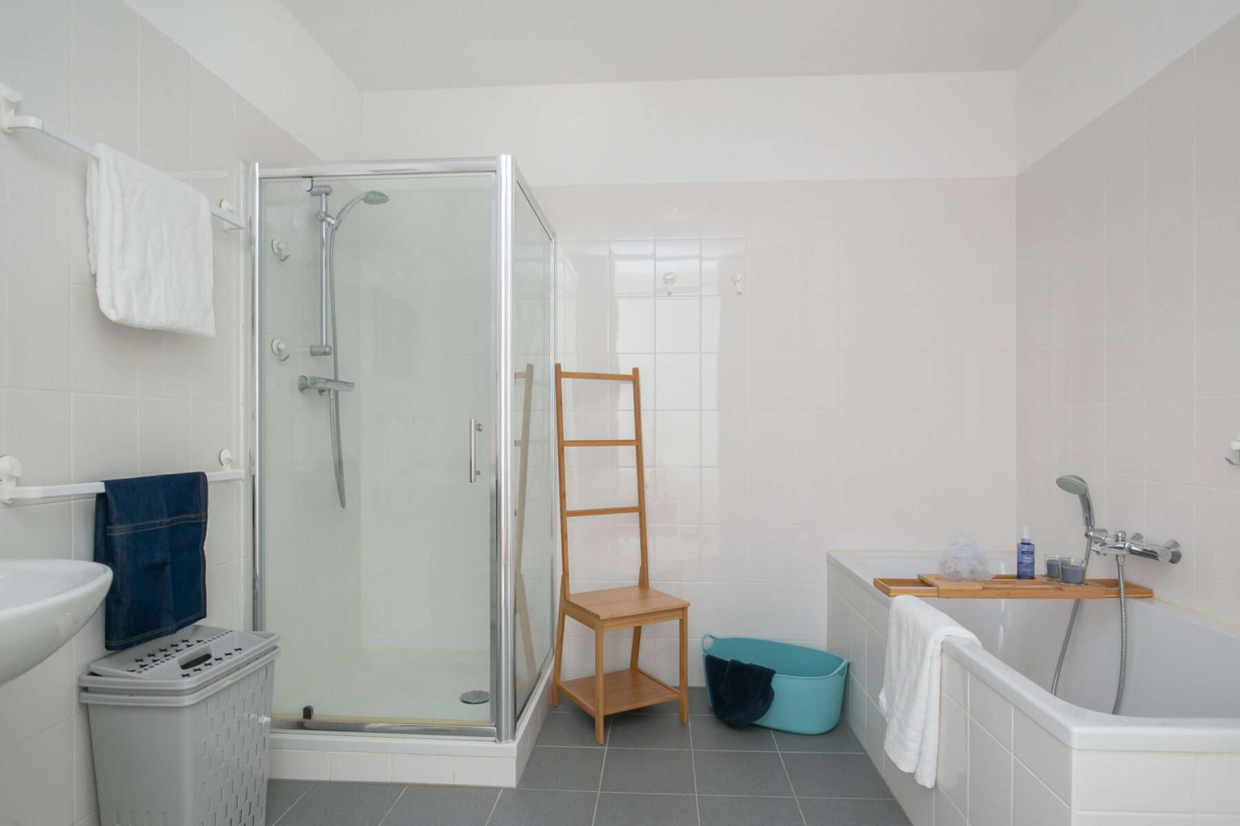Aan de andere zijde van het appartement bevinden zich twee zeer ruime slaapkamers en de badkamer . De hoofdslaapkamer heeft een grote kastenwand met schuifdeuren en een prettige lichtinval. De badkamer is volledig wit betegeld en uitgerust met een douche, wastafel, ligbad, tweede toilet en handdoekradiator.