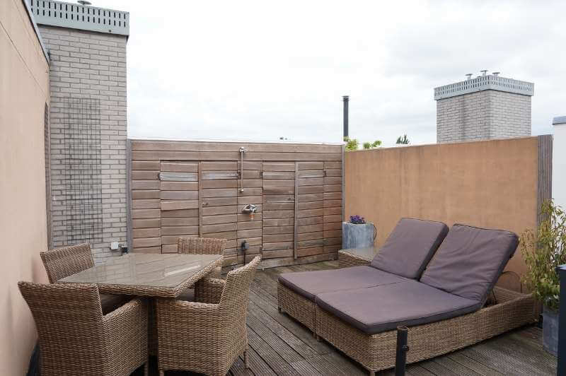 Het dakterras van circa 27 m² heeft de gehele dag zon en veel privacy, een buitendouche en is door de ligging direct aan de woonkamer ook heel praktisch.