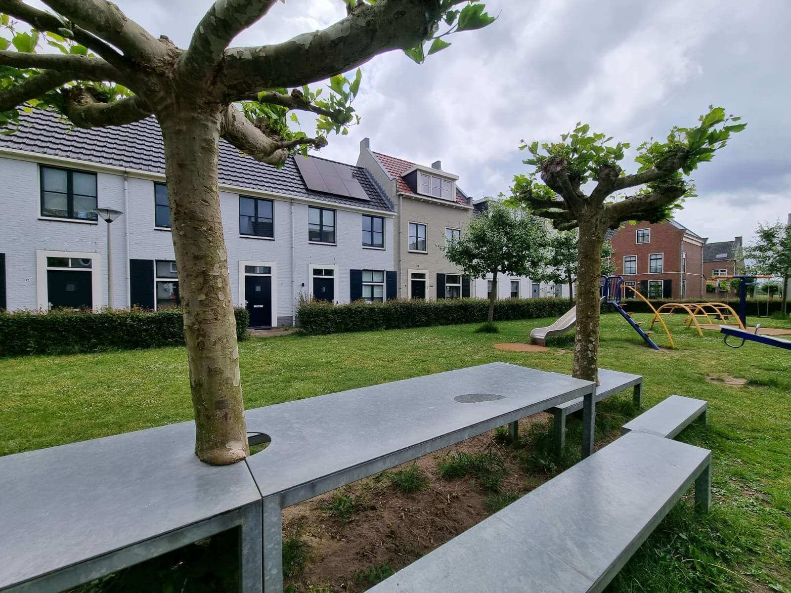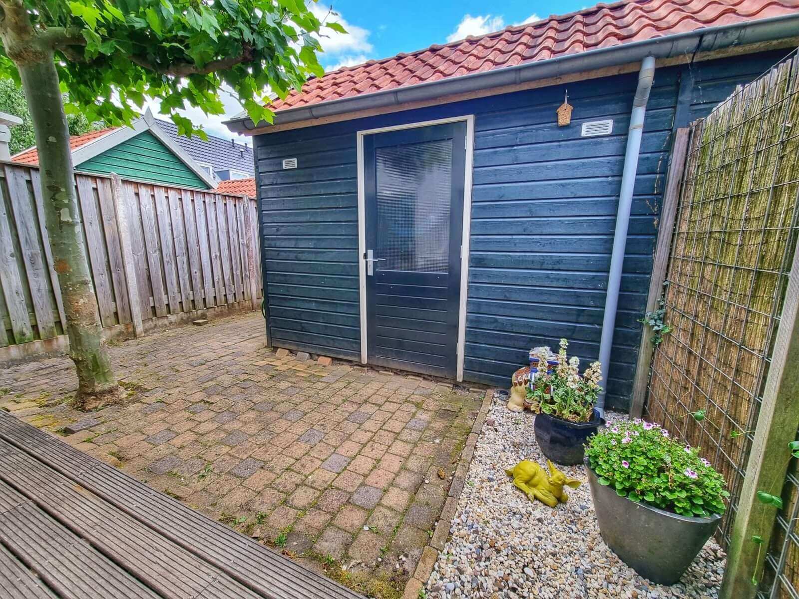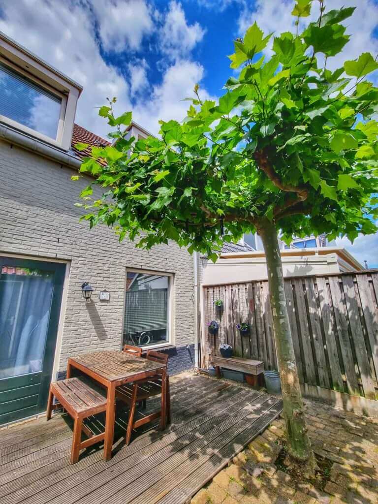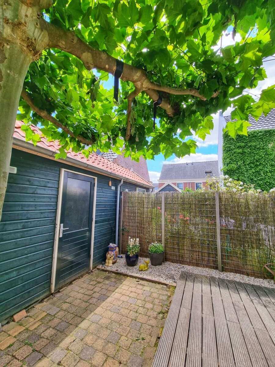 De besloten tuin achter het huis is volledig omheind en volledig bestraat en vraagt niet veel onderhoud. De tuin biedt veel privacy en zon vanaf de vroege ochtend. Er staat een met hout beklede berging voor de fietsen en de tuinspullen en er is een poort die uitkomt op het pad achter de huizen.