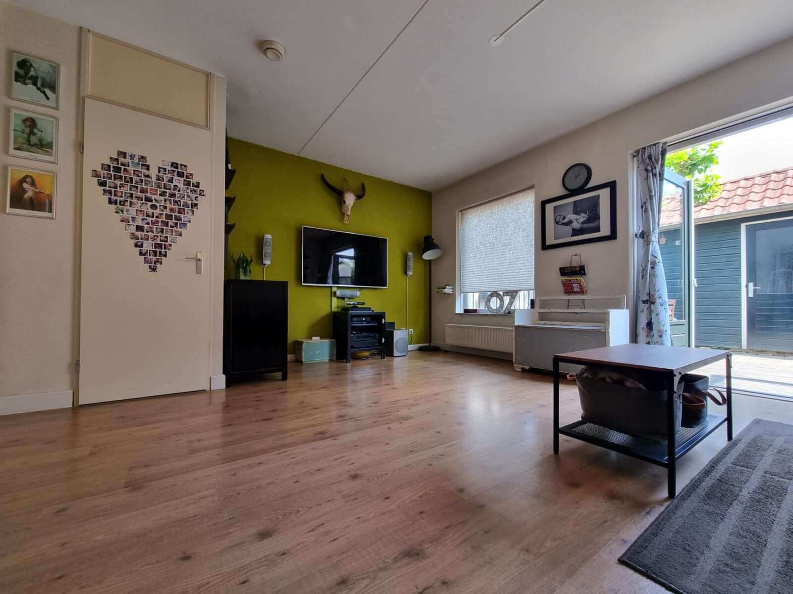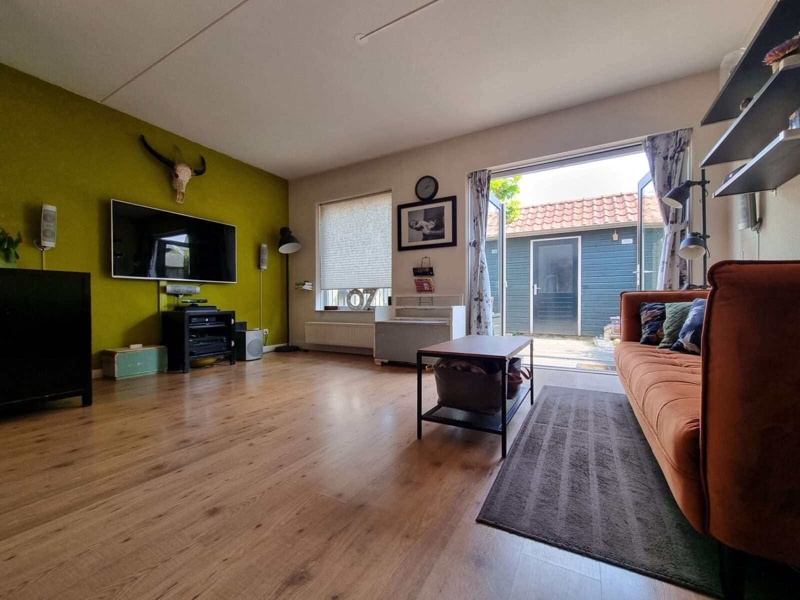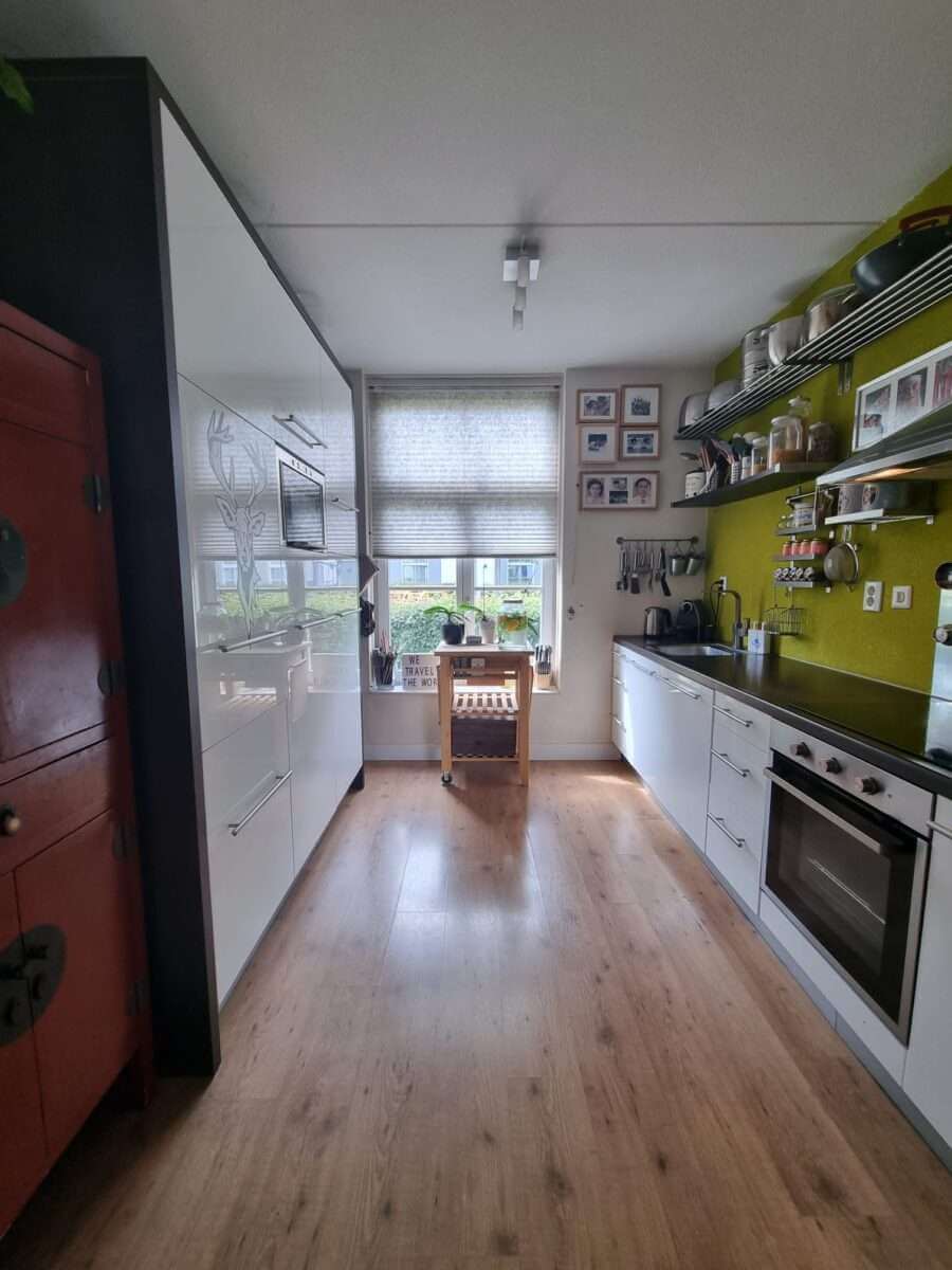 Hal met meterkast, toilet, de trap naar boven en een diepe bergkast. Ruime woonkamer met veel lichtinval en openslaande deuren naar de achtertuin. De moderne keuken heeft tegen één lange wand en een hogere kast met apparatuur tegen de wand er tegenover. De keuken is voorzien van inbouwapparatuur zoals een inductiekookplaat, afzuigkap, oven, vaatwasser en koelkast.
