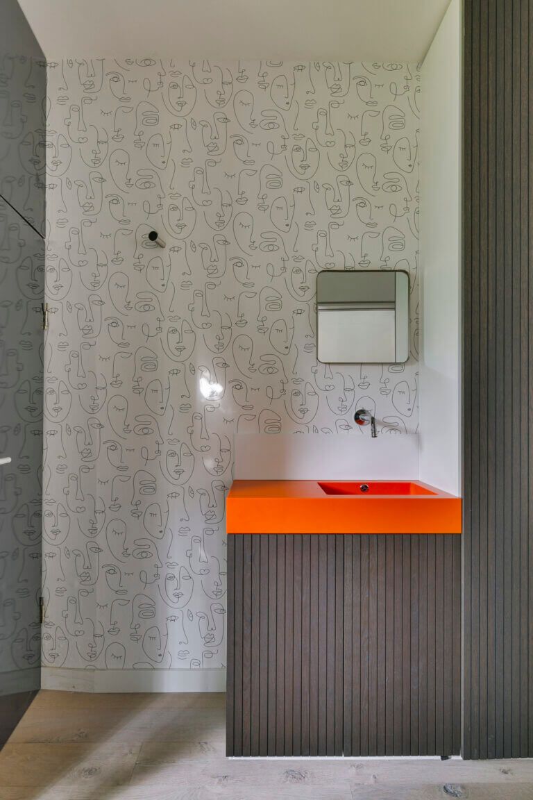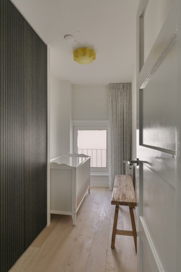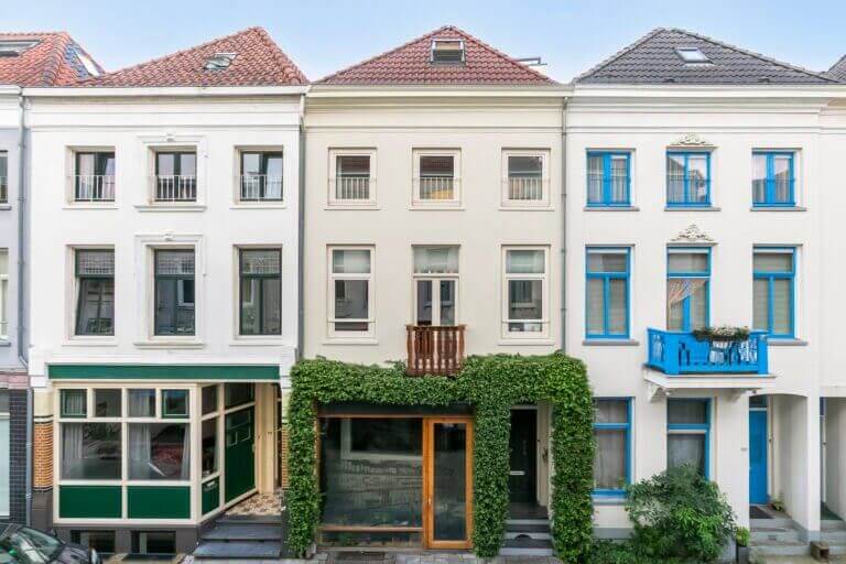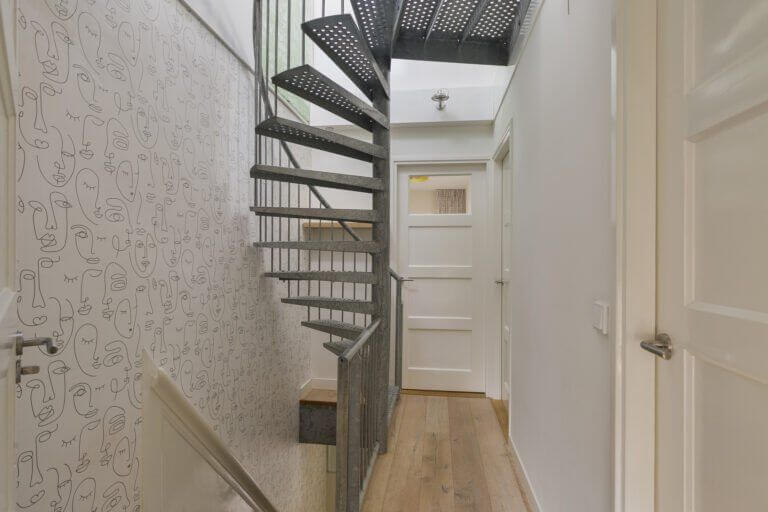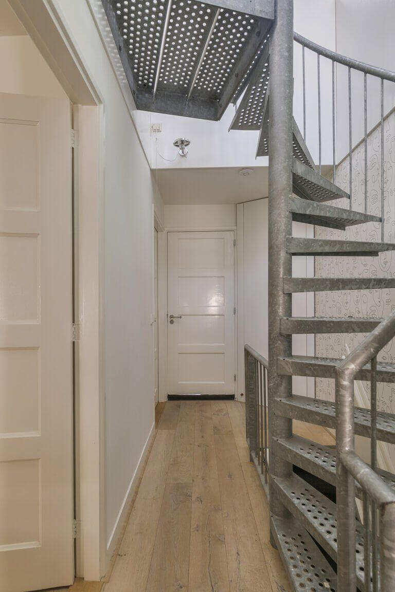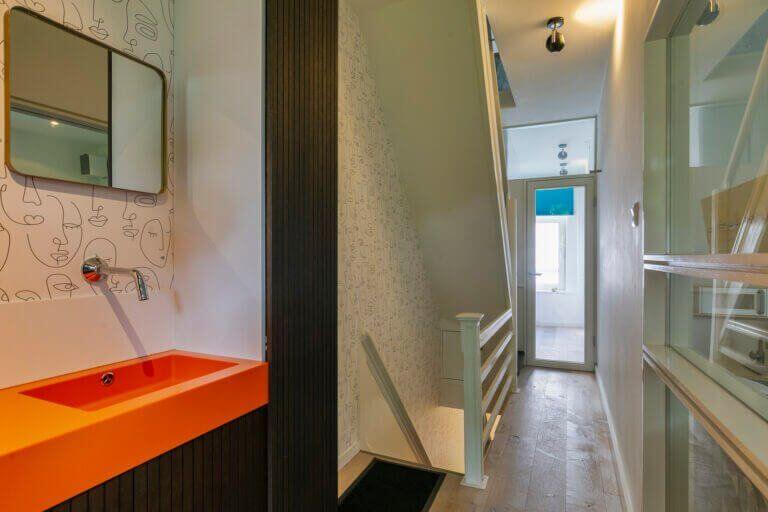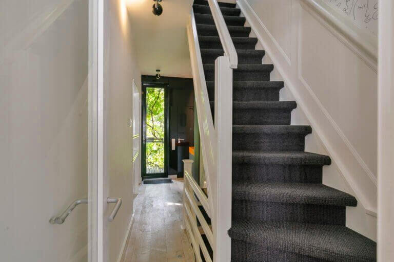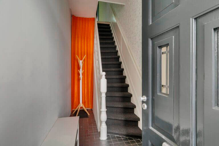 De rechterdeur in de voorgevel geeft toegang tot de hal. Vanuit de hal ga je via de trap naar de eerste verdieping.