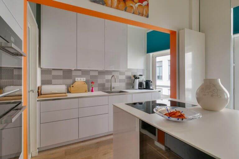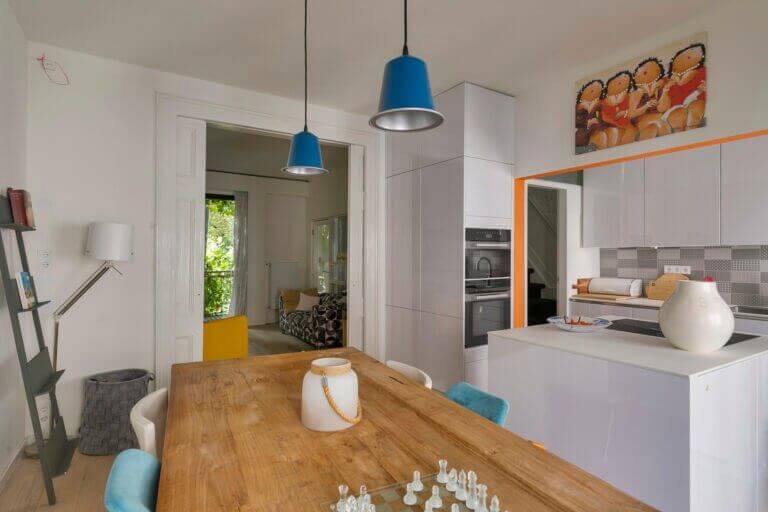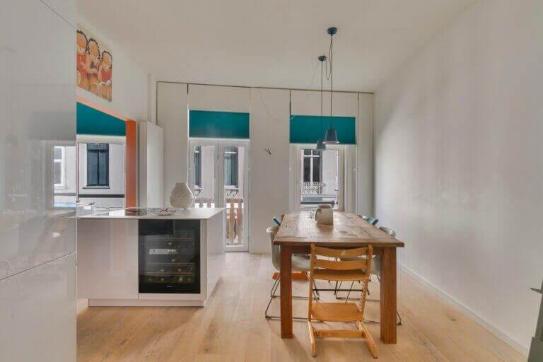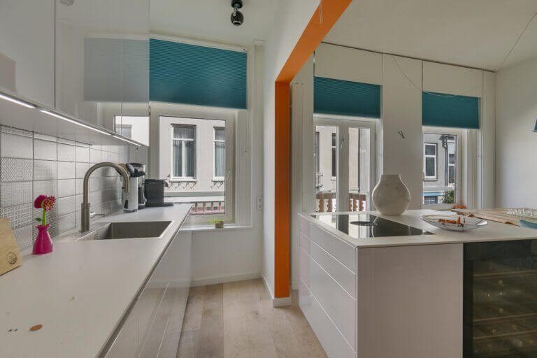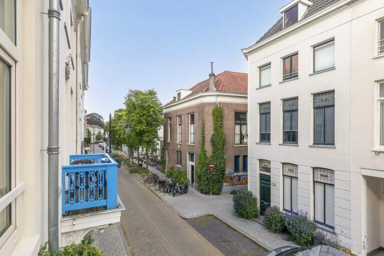 Overloop met design toilet, vanuit de hal bereik je de open keuken met openslaande deuren naar het prijswinnende balkon dat in samenwerking met kunstenaar Alphons ter Avest is gemaakt. De moderne keuken is uitgerust met een kookeiland en voorzien van alle gemakken en diverse inbouw apparatuur zoals: inductie kookplaat, koelkast, oven, wijnklimaatkast, vaatwasser en vriezer. De royale woonkamer – en suite heeft hoge plafonds en de authentieke details zijn behouden, aangrenzend is het tweede balkon aan de achterzijde gelegen.