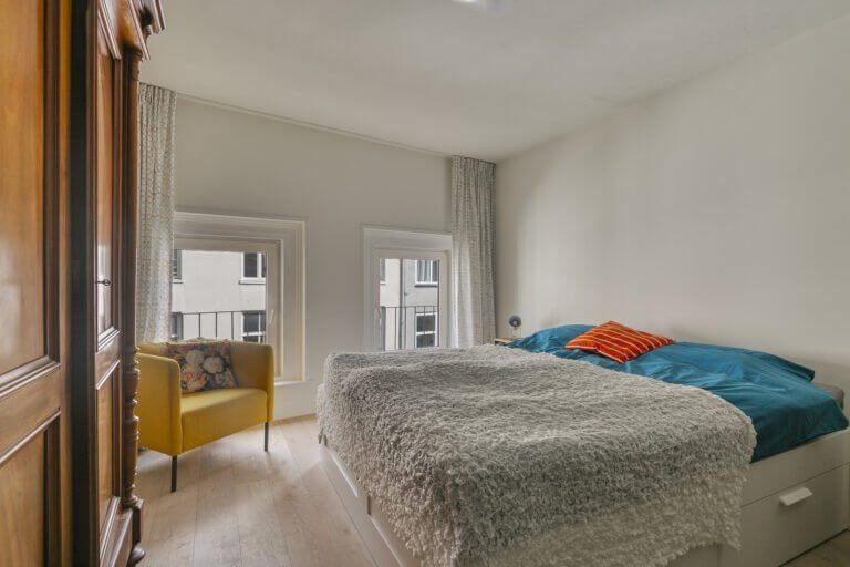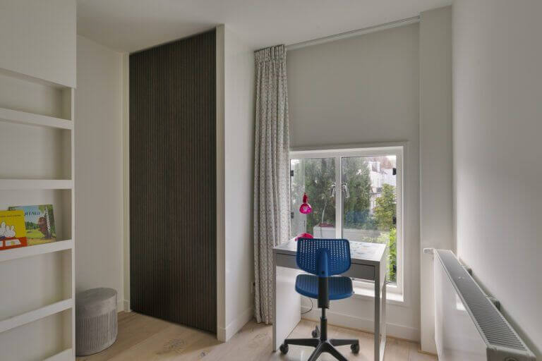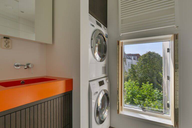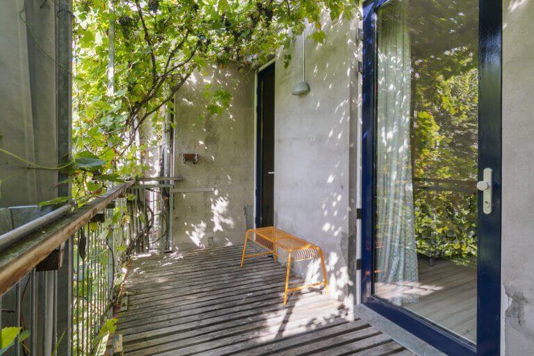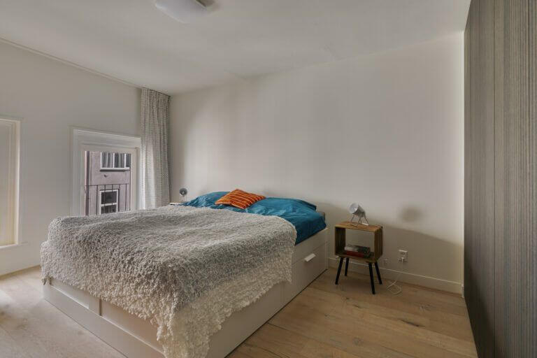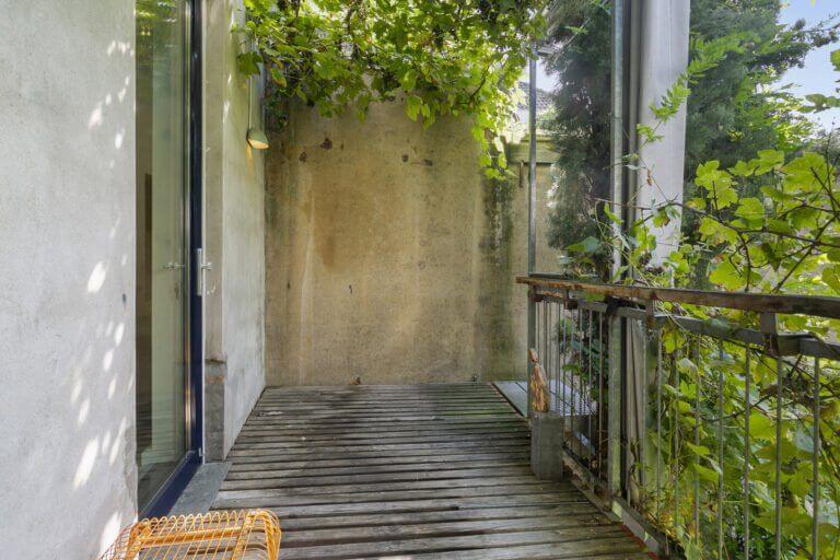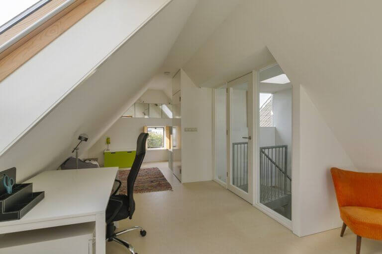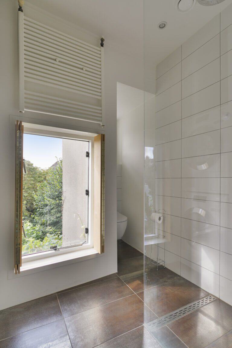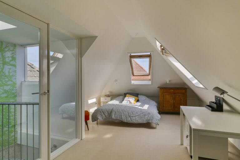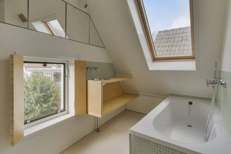 Als je met de stalen spiltrap naar boven gaat dan kom je op de derde verdieping. Hier is een grote zolderruimte met een hoogte van bijna 2,50 meter en veel lichtinval door de grote dakramen en het raam in de achtergevel. Dit is de heerlijk riante Masterbedroom, inclusief een open badkamer met ligbad en wastafel. Open de houten luiken rondom het raam in de achtergevel en je kunt vanuit bad genieten van het uitzicht op de bomen aan de achterzijde.