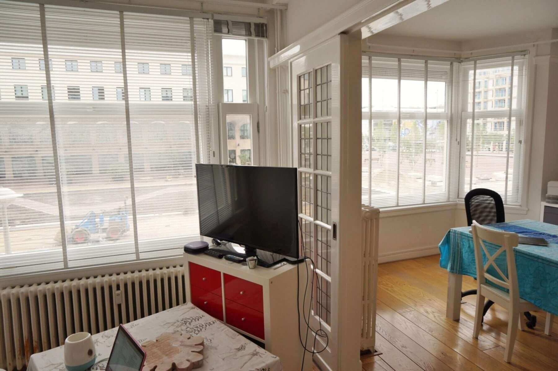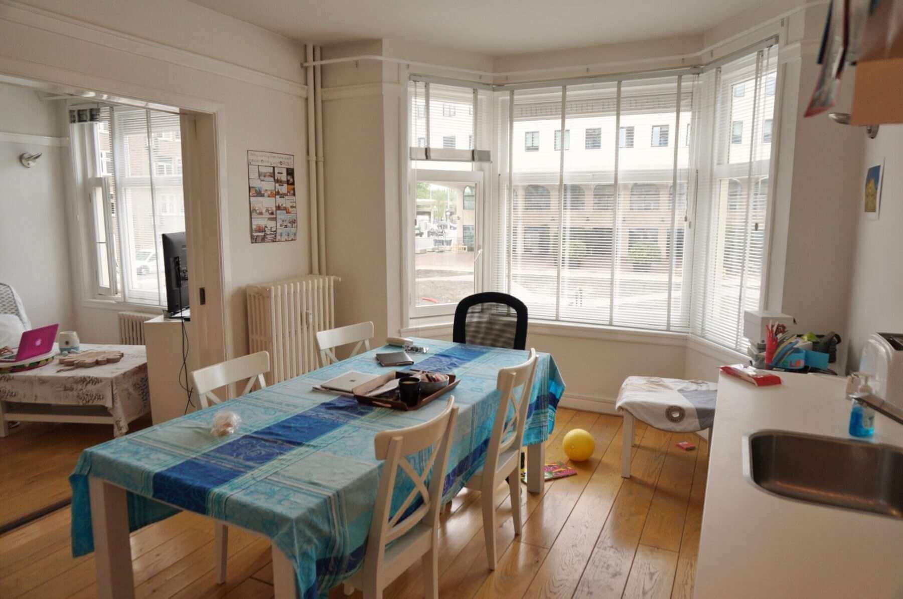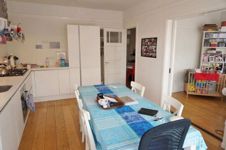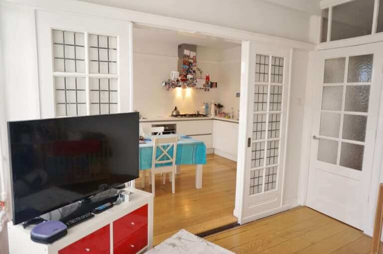 De woning is gelegen op de eerste verdieping van een karakteristiek jaren ’30 pand aan het Stadionplein in Amsterdam Zuid.