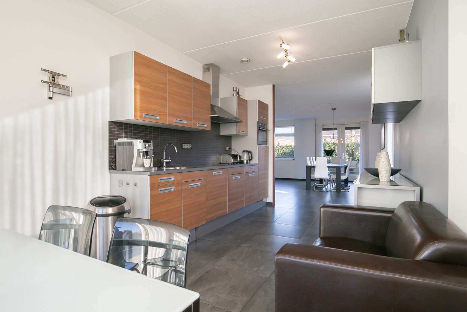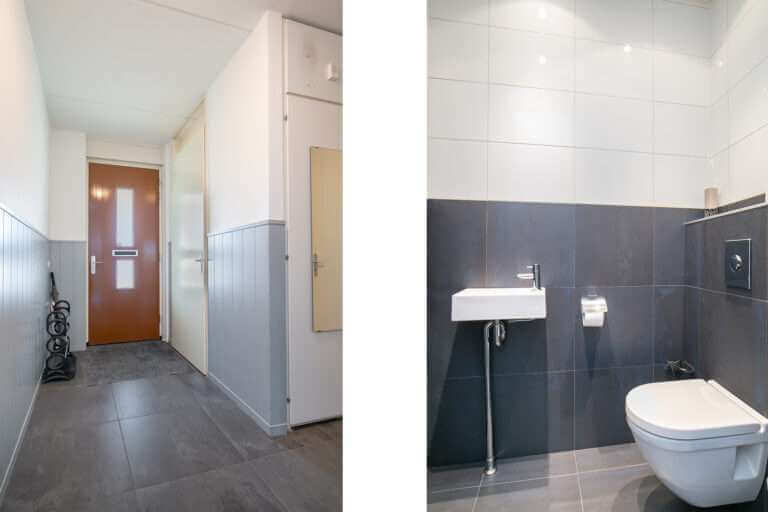 Begane grond: Hal / Entree met tegelvloer welke over de gehele begane grond is doorgelegd, meterkast, trapopgang en ‘n geheel betegelde toiletruimte met wandcloset en fonteintje. Vanuit de hal is de garage bereikbaar welke deels voorzien is van ‘n bergvliering. De woonkamer is voorzien van openslaande tuindeuren en bied toegang naar de geheel omsloten tuin. De deels open (woon)keuken is aan de straatzijde gelegen en is voorzien van ‘n moderne keukeninrichting in rechte opstelling met o.a. ‘n keramische kookplaat, roestvrijstalen afzuigschouw, combimagnetron, koelkast en vaatwasser.