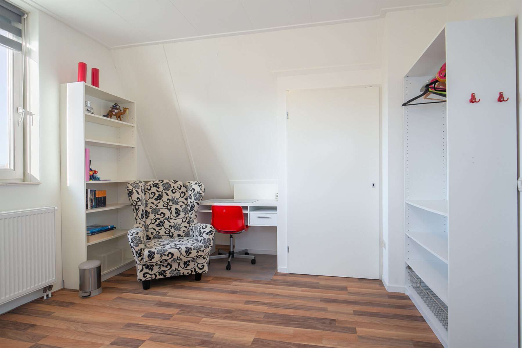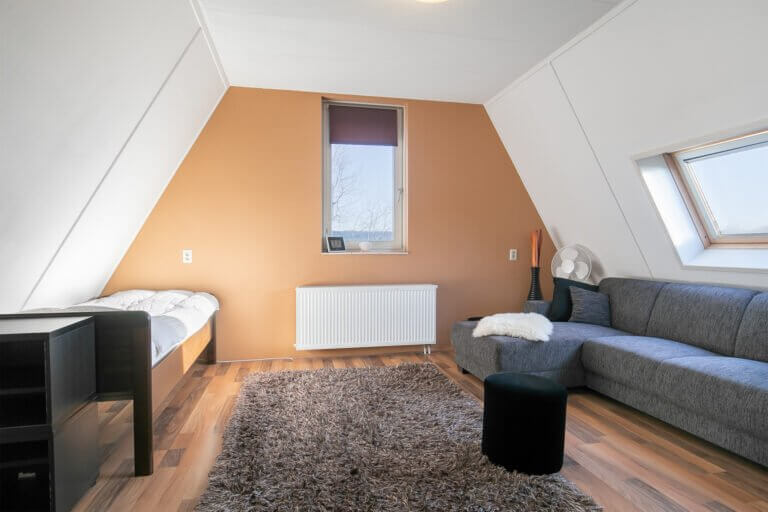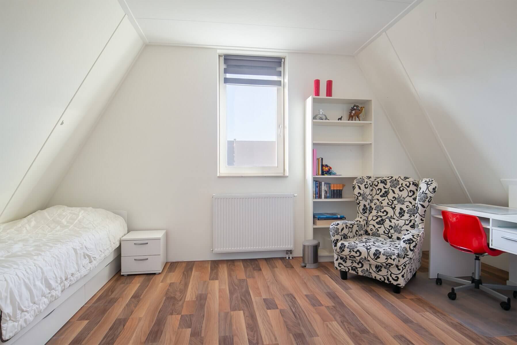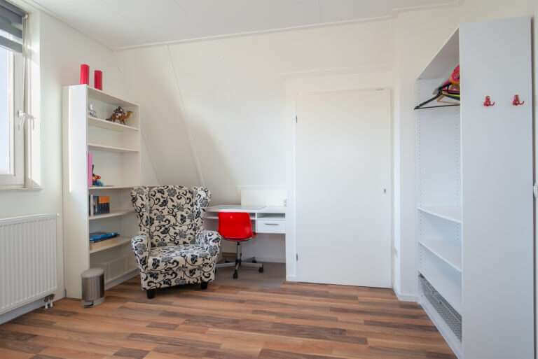 Twee slaapkamers aanwezig met een laminaatvloer, dakkapel en aansluiting voor wasmachine. Vervolgens is er tussen de slaapkamers ruimte voor een werkplek.