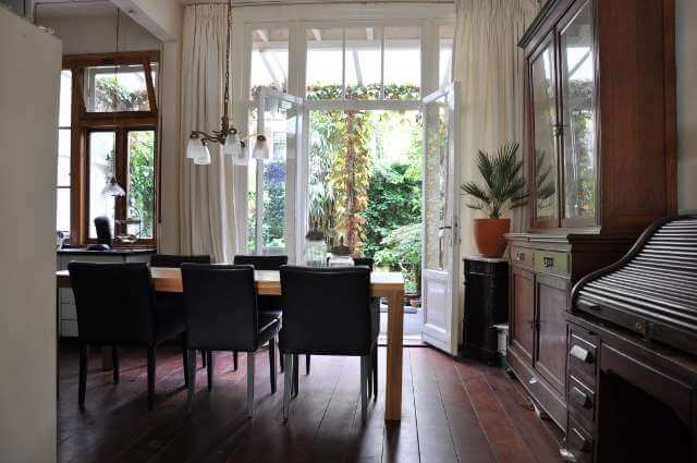 Royale woonkamer met houten vloerdelen. Openslaande deuren naar de tuin aan achterzijde waar ook de open leef-keuken zich bevindt.